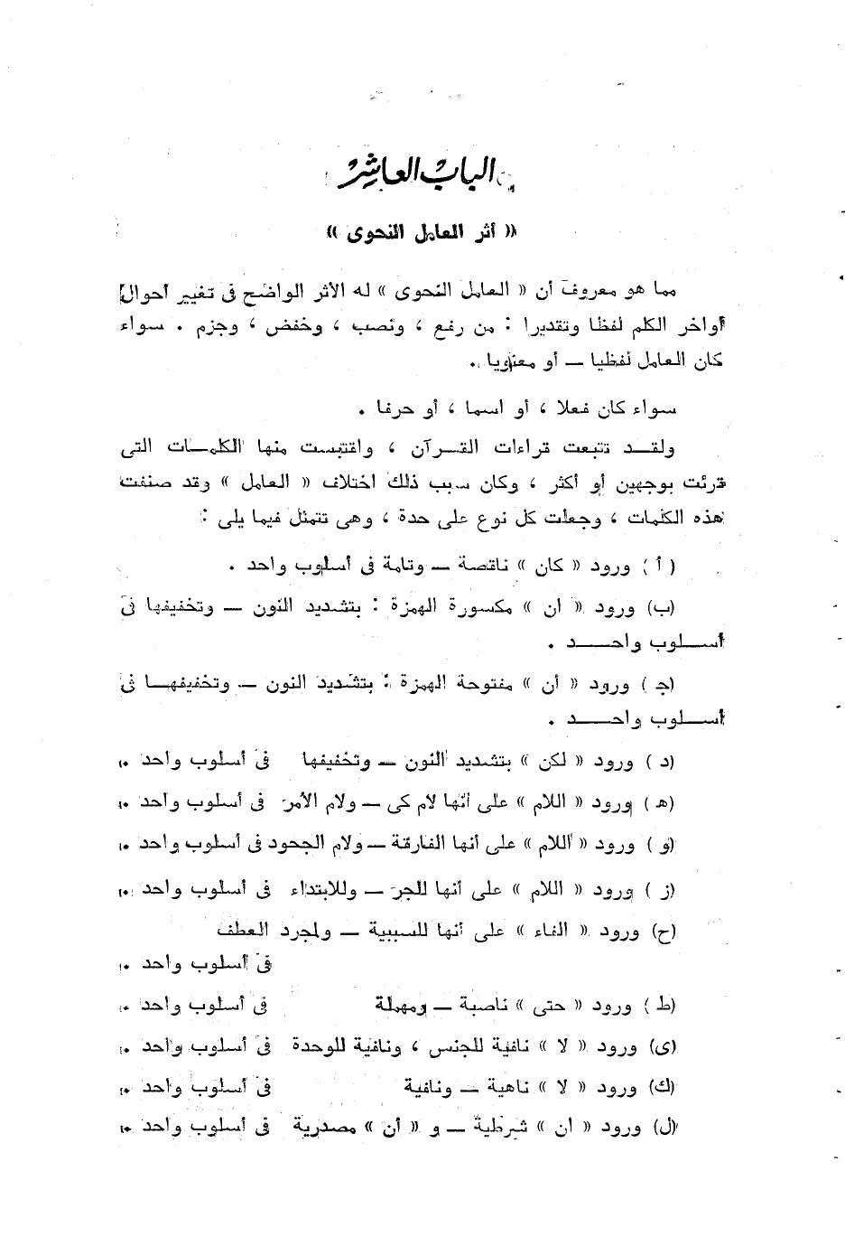 ولقد تتبعت قراءات القرآن، واقتبست منها الكلمات التي قرئت بوجهين أو أكثر، وكان سبب ذلك اختلاف «العامل» وقد صنفت هذه الكلمات، وجعلت كل نوع على حدة، وهي تتمثل فيما يلي: