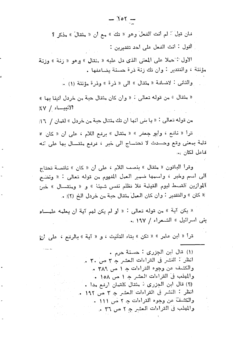 وقرأ الباقون «مثقال» بنصب اللام، على أن «كان» ناقصة تحتاج الى اسم وخبر، واسمها ضمير العمل المفهوم من قوله تعالى: وَنَضَعُ الْمَوازِينَ الْقِسْطَ لِيَوْمِ الْقِيامَةِ فَلا