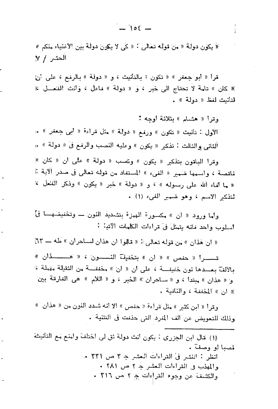 وقرأ الباقون بتذكير «يكون» ونصب «دولة» على أن «كان» ناقصة، واسمها ضمير «الفيء» المستفاد من قوله تعالى في صدر الآية: ما أَفاءَ اللَّهُ عَلى رَسُولِهِ و «دولة» خبر «يكون» وذكر الفعل، لتذكير الاسم، وهو ضمير الفيء (¬2).