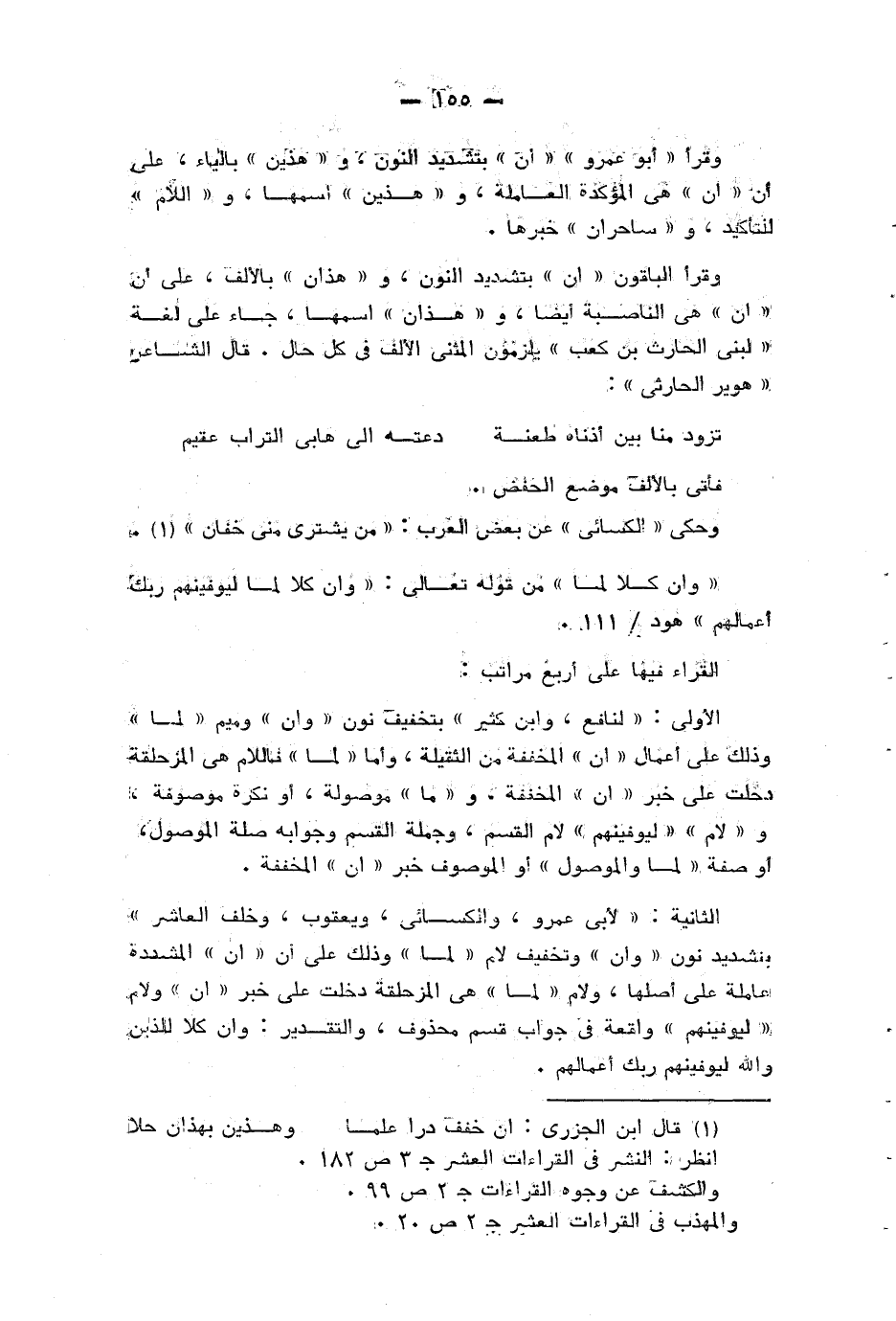 وقرأ الباقون «ان» بتشديد النون، و «هذان» بالألف، على أن «أن» هي الناصبة أيضا، و «هذان» اسمها، جاء على لغة «لبني الحارث ابن كعب» يلزمون المثنى الألف في كل حال. قال الشاعر: «هوير الحارثي»: