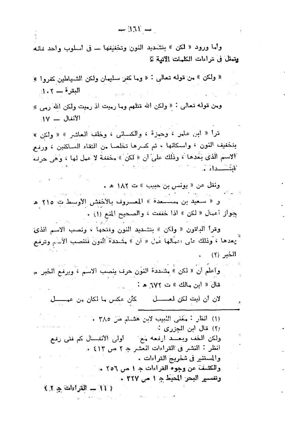 * وأما ورود «لكن» بتشديد النون وتخفيفها- في أسلوب واحد فانه يتمثل في قراءات الكلمات الآتية:
