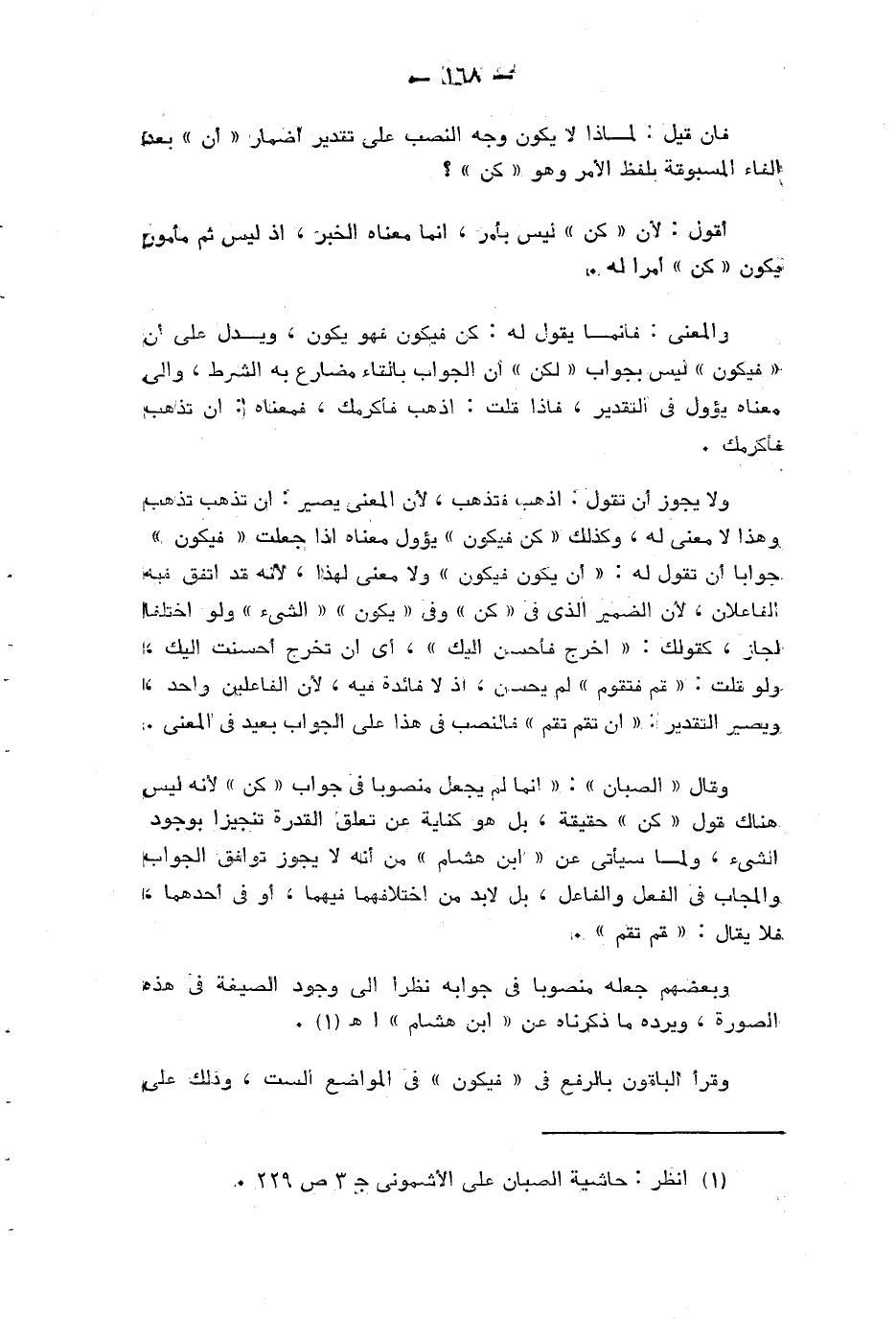 وقال «الصبان»: «انما لم يجعل منصوبا في جواب «كن» لأنه ليس هناك قول «كن» حقيقة، بل هو كناية عن تعلق القدرة تنجيزا بوجود الشيء، ولما سيأتي عن «ابن هشام» من أنه لا يجوز توافق الجواب والمجاب في الفعل والفاعل، بل لا بد من اختلافهما فيهما أو في أحدهما، فلا يقال: «قم تقم».
