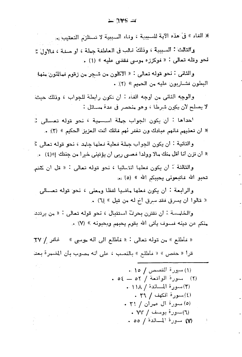 والثالث: السببية، وذلك غالب في العاطفة جملة، أو صفة، فالأول: