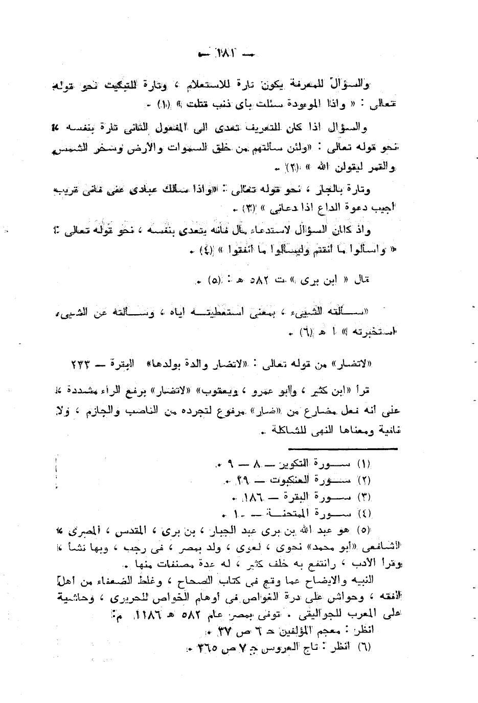 واذ كان السؤال لاستدعاء مال فانه يتعدى بنفسه نحو قوله تعالى: وَسْئَلُوا ما أَنْفَقْتُمْ وَلْيَسْئَلُوا ما أَنْفَقُوا (¬4) قال «ابن بري» ت 582 هـ: (¬5) «سألته الشيء بمعنى استعطيته إياه وسألته عن الشيء استخبرته» أهـ (¬6) «لا تضار» من قوله تعالى: لا تُضَارَّ والِدَةٌ بِوَلَدِها (¬7) قرأ «ابن كثير، وأبو عمرو، ويعقوب» «لا تضار» برفع الراء مشددة، على أنه فعل مضارع من «ضار» مرفوع لتجرده من الناصب والجازم، ولا نافية ومعناها النهي للمشاكلة.