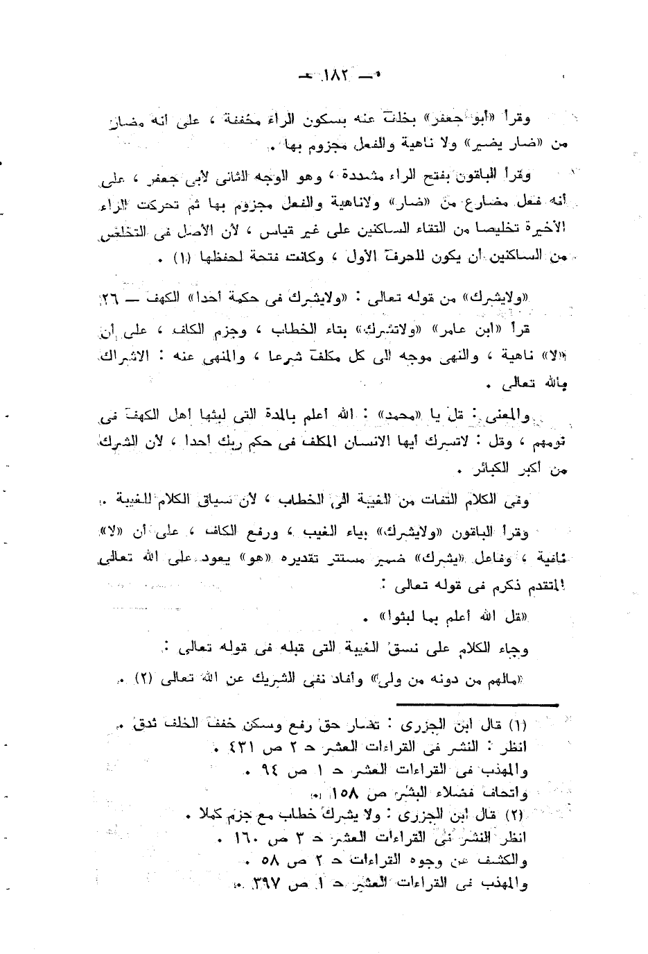 وقرأ الباقون «ولا يشرك» بياء الغيب ورفع الكاف، على أن «لا» نافية، وفاعل «يشرك» ضمير مستتر تقديره «هو» يعود على الله تعالى المتقدم ذكره في قوله تعالى: قُلِ اللَّهُ أَعْلَمُ بِما لَبِثُوا.