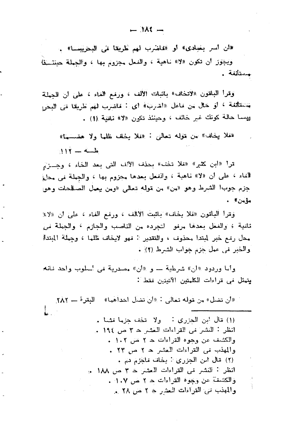وقرأ الباقون «فلا يخاف» باثبات الألف، ورفع الفاء، على أن «لا» نافية، والفعل بعدها مرفوع لتجرده من الناصب والجازم، والجملة في محل رفع خبر لمبتدإ محذوف، والتقدير: فهو لا يخاف ظلما، وجملة المبتدأ والخبر في محل جزم جواب الشرط (¬3).