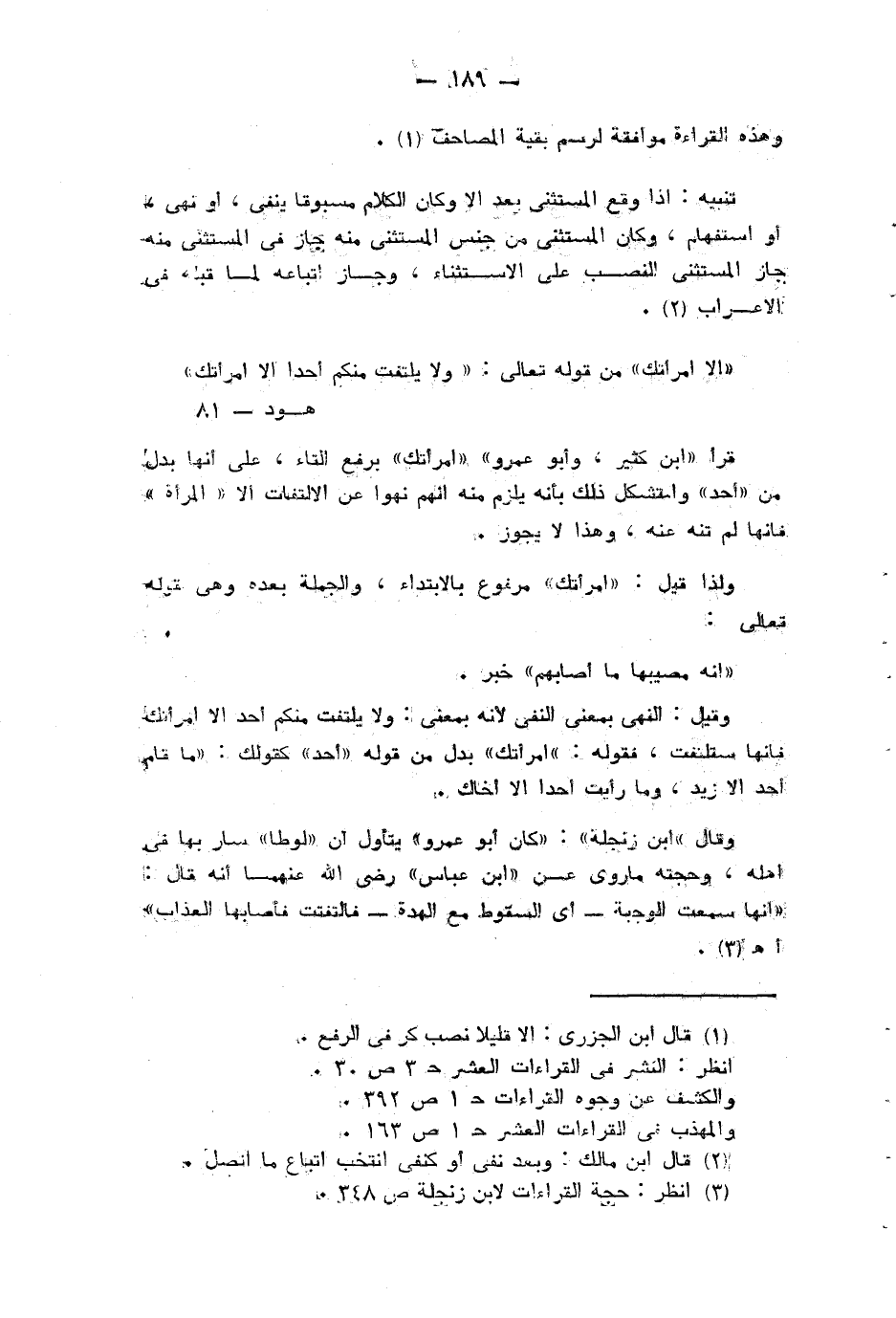 وقال «ابن زنجلة»: «كان أبو عمرو» يتأول أن «لوطا» سار بها في أهله، وحجته ما روي عن «ابن عباس» رضي الله عنهما أنه قال: «أنها سمعت الوجبة- أي السقوط مع الهدة- فالتفتت فأصابها العذاب» أهـ (¬4).