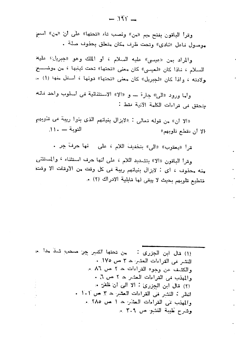 * وأما ورود «الى» جارة- و «الا» الاستثنائية في أسلوب واحد فانه يتحقق في قراءات الكلمة الآتية فقط: