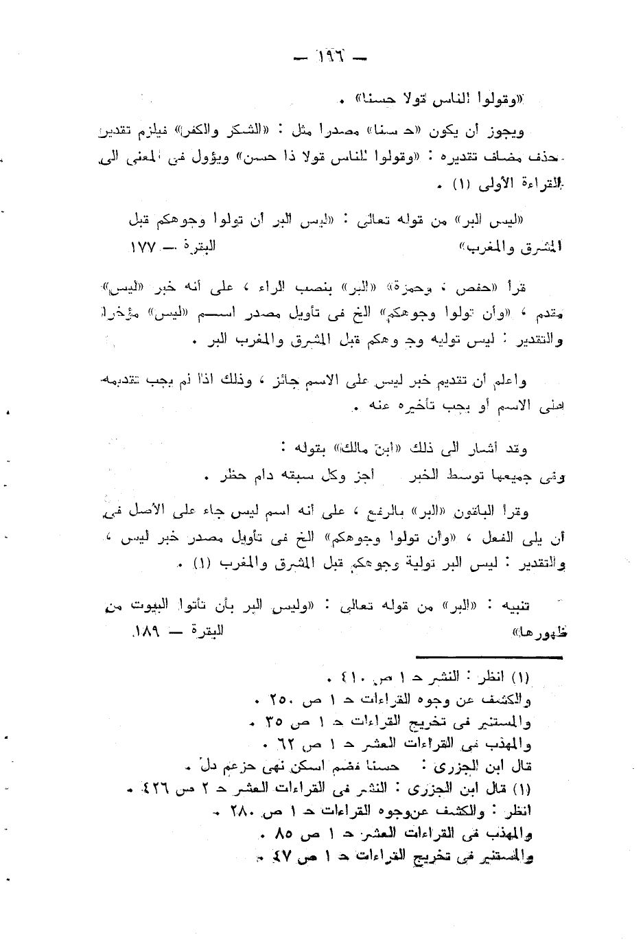 وقرأ الباقون «البر» بالرفع، على أنه اسم ليس جاء على الأصل في أن يلي الفعل، «وأن تولوا وجوهكم» الخ في تأويل مصدر خبر ليس، والتقدير: ليس البر تولية وجوهكم قبل المشرق والمغرب (¬3).