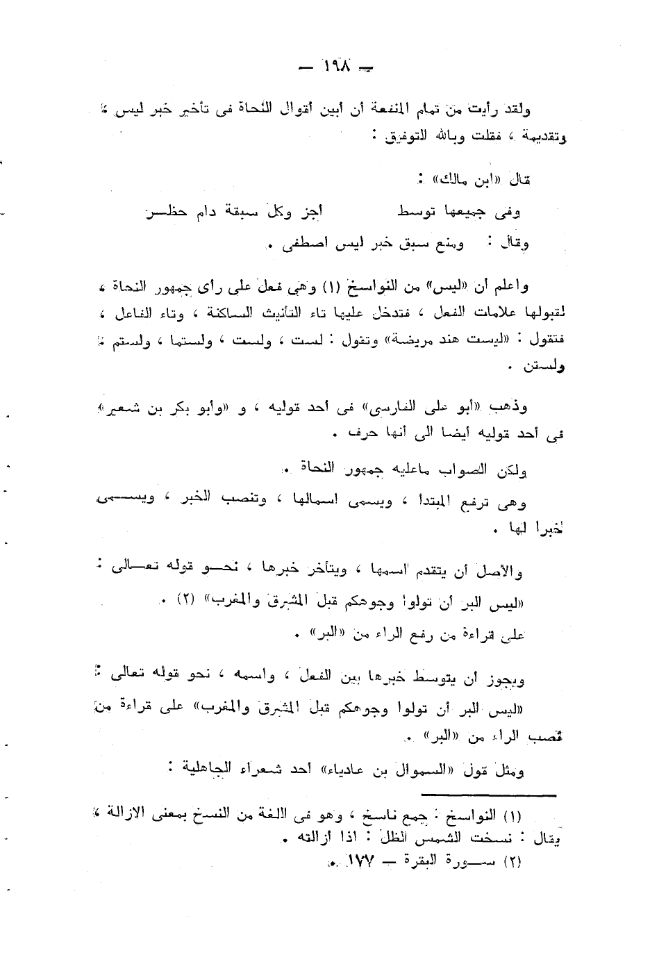 ولقد رأيت من تمام المنفعة أن أبين أقوال النحاة في تأخير خبر ليس، وتقديمه، فقلت وبالله التوفيق: