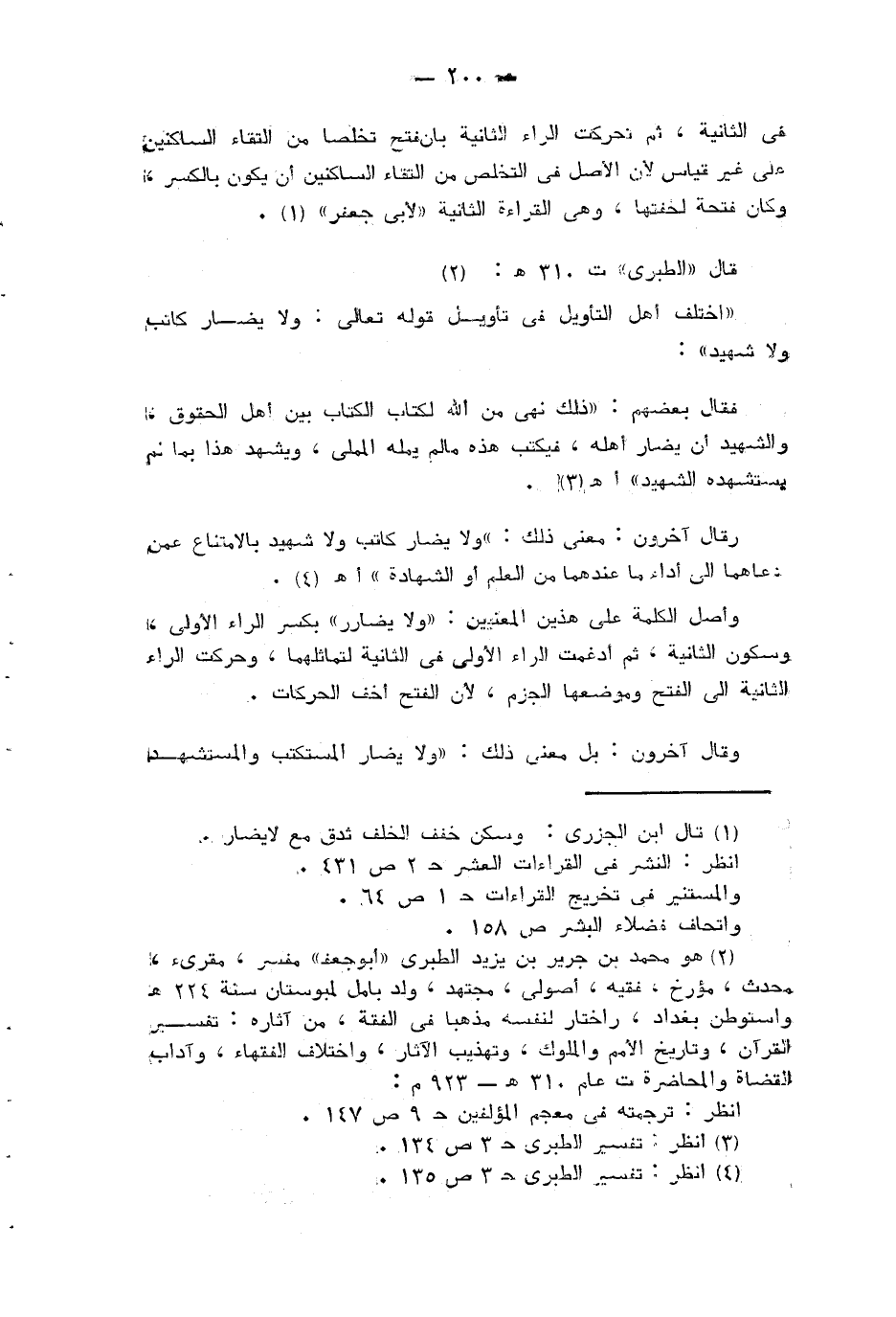 وقال آخرون: معنى ذلك: «ولا يضار كاتب ولا شهيد بالامتناع عمن دعاهما الى أداء ما عندهما من العلم أو الشهادة» أهـ (¬4).