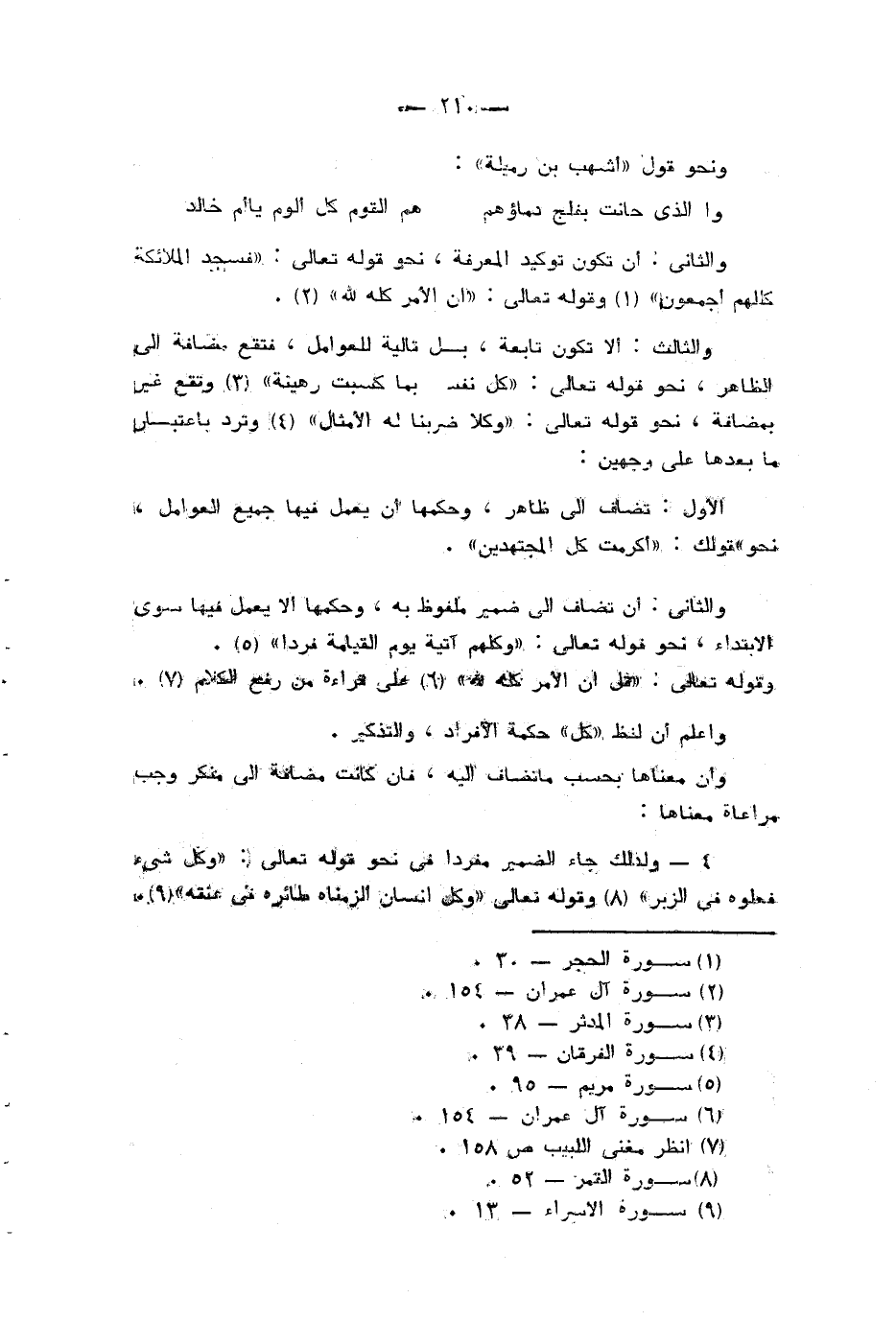 واعلم أن لفظ «كل» حكمة الإفراد والتذكير.