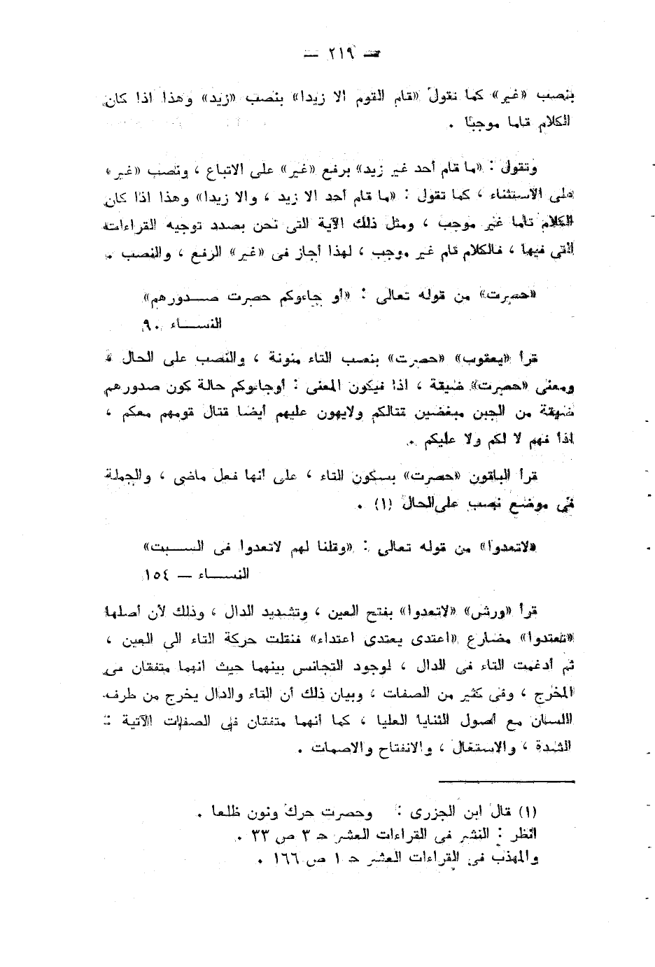 وتقول: «ما قام أحد غير زيد» برفع «غير» على الاتباع، ونصب «غير» على الاستثناء، كما تقول: «ما قام أحد الا زيد، والا زيدا» وهذا اذا كان الكلام تاما غير موجب، مثل ذلك الآية التي نحن بصدد توجيه القراءات التي فيها، فالكلام تام غير موجب، لهذا أجاز في «غير» الرفع، والنصب.