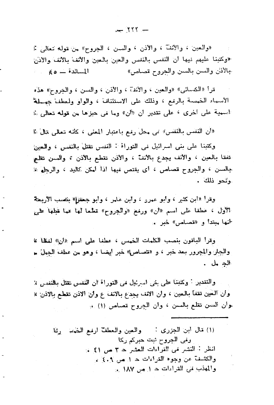 «والعين، والأنف، والأذن، والسن، الجروح» من قوله تعالى: