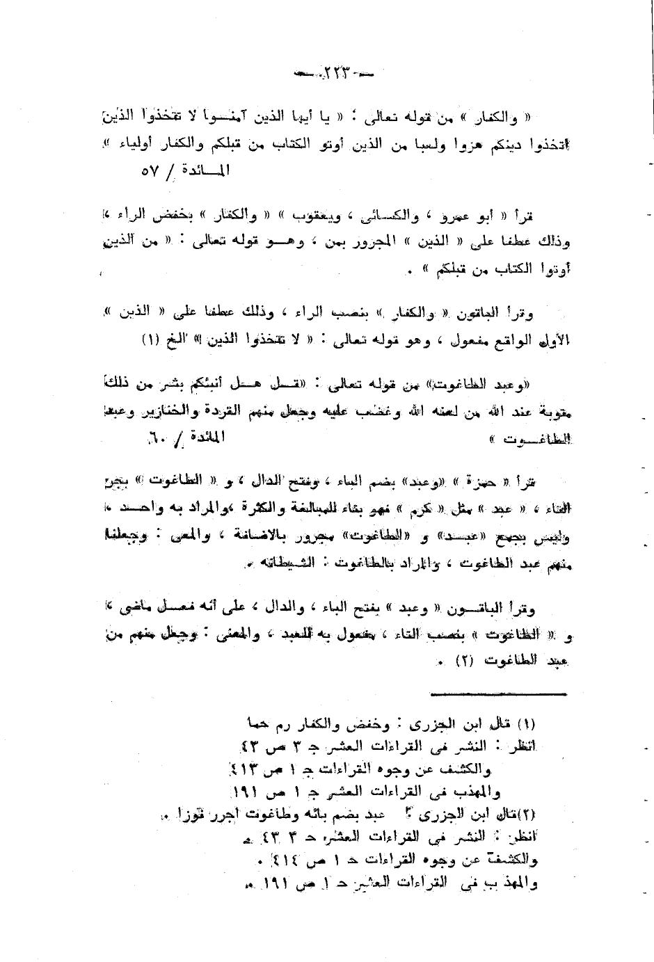 وقرأ الباقون «وعبد» بفتح الباء، والدال، على أنه فعل ماض و «الطاغوت» بنصب التاء، مفعول به للعبد، والمعنى: وجعل منهم من عبد الطاغوت (¬5).
