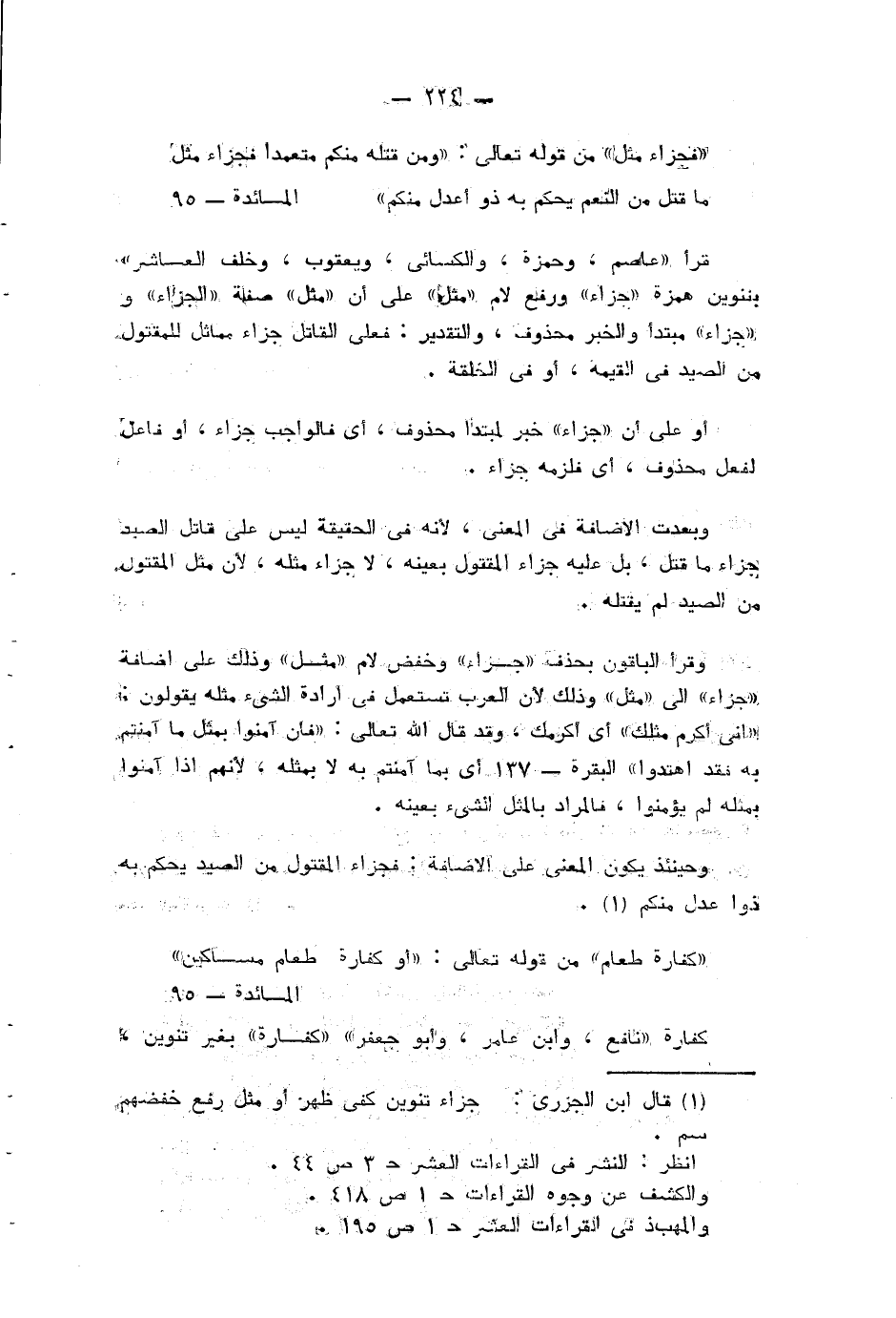 وقرأ الباقون بحذف «جزاء» وخفض لام «مثل» وذلك على اضافة «جزاء» الى «مثل» وذلك لأن العرب تستعمل في إرادة الشيء مثله
