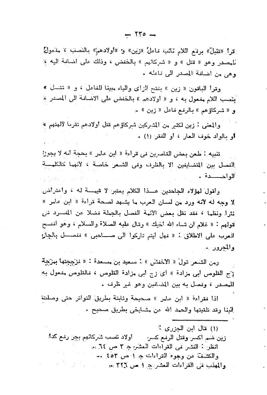 تنبيه: طعن بعض القاصرين من قراءة «ابن عامر» بحجة أنه لا يجوز الفصل بين المتضايفين الا بالظرف وفي الشعر خاصة، لأنهما كالكلمة الواحدة.