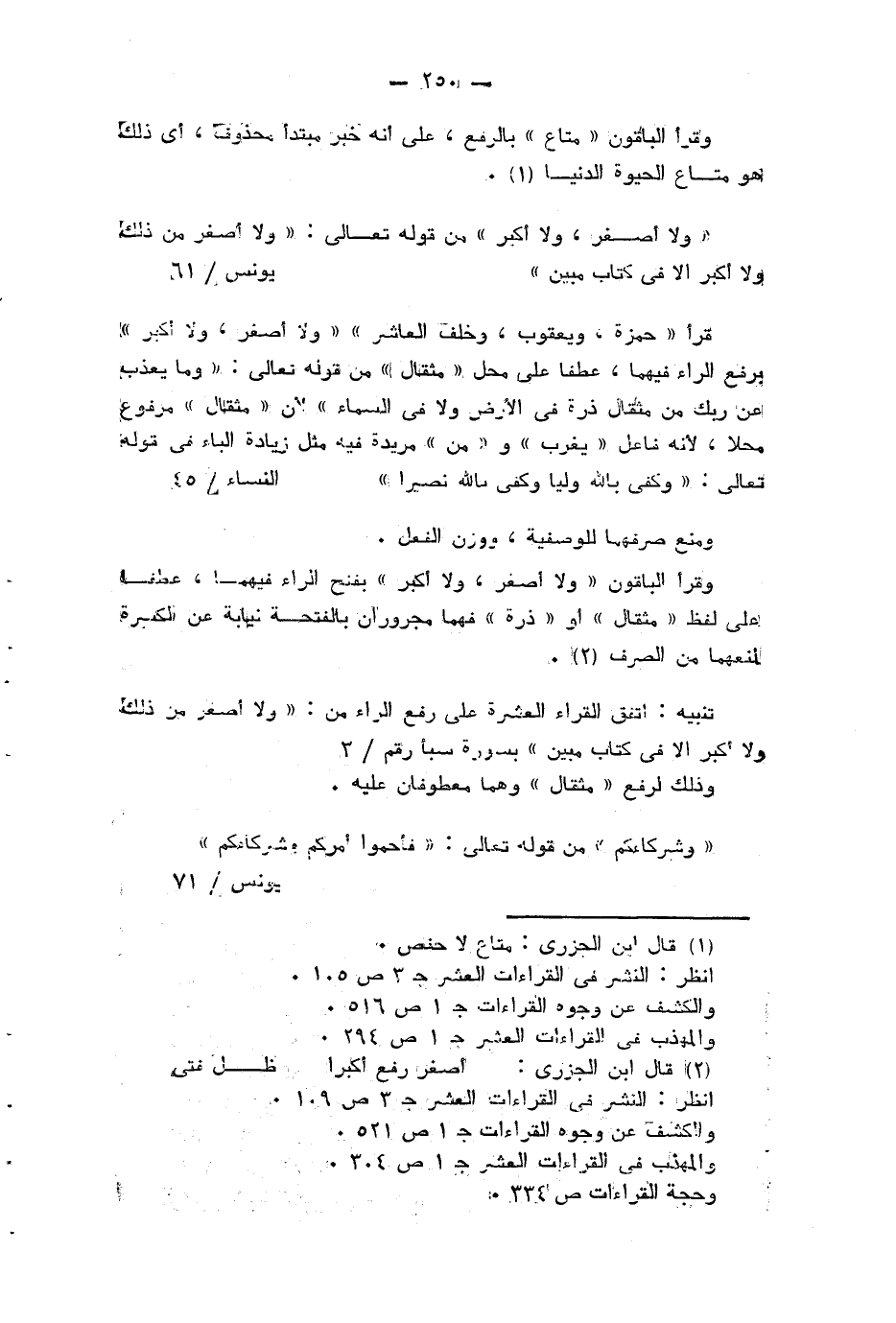 تنبيه: اتفق القراء العشرة على رفع الراء من: وَلا أَصْغَرُ مِنْ ذلِكَ وَلا أَكْبَرُ إِلَّا فِي كِتابٍ مُبِينٍ (¬5).