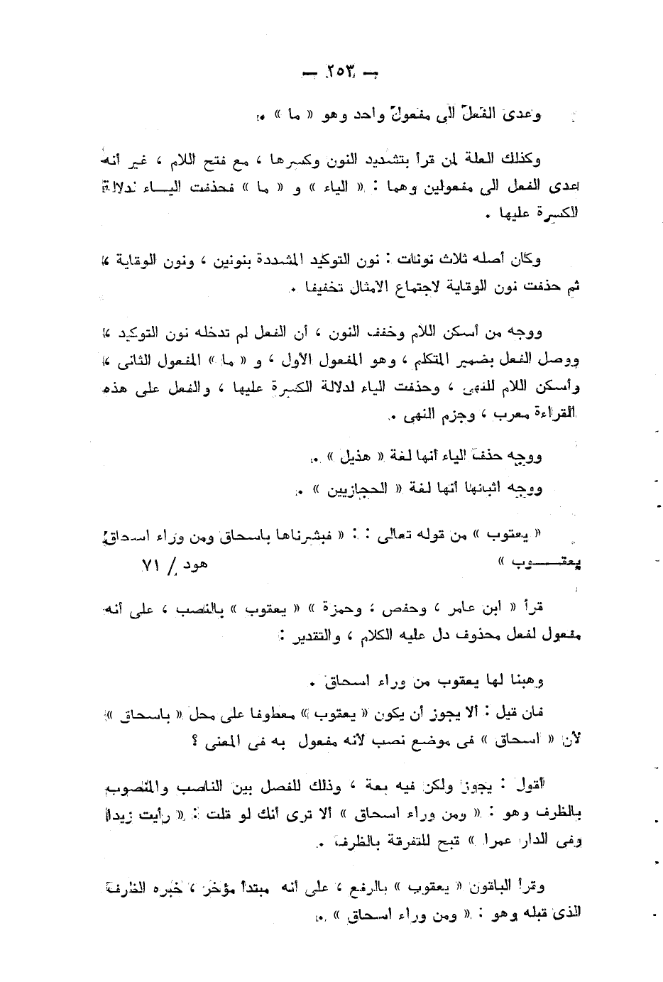 وكذلك العلة لمن قرأ بتشديد النون وكسرها، مع فتح اللام، غير أنه عدى الفعل الى مفعولين وهما: «الياء» و «ما» فحذفت الياء لدلالة الكسرة عليها.