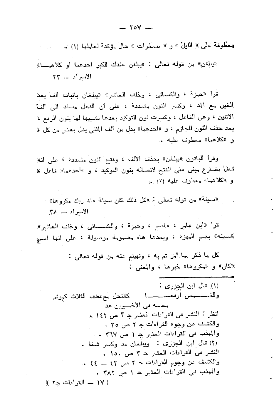 وقرأ الباقون «يبلغن» بحذف الألف، وفتح النون مشددة، على أنه فعل مضارع مبني على الفتح لاتصاله بنون التوكيد، و «أحدهما» فاعل، و «كلاهما» معطوف عليه (¬2).