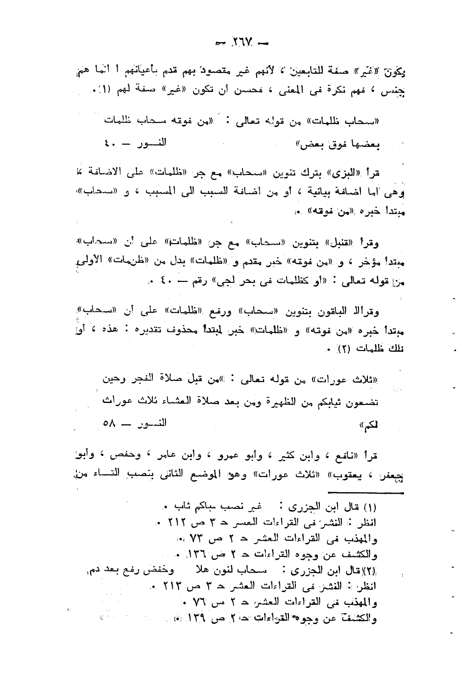 وقرأ الباقون بتنوين «سحاب» ورفع «ظلمات» على أن «سحاب» مبتدأ خبره «من فوقه» و «ظلمات» خبر لمبتدإ محذوف تقديره: