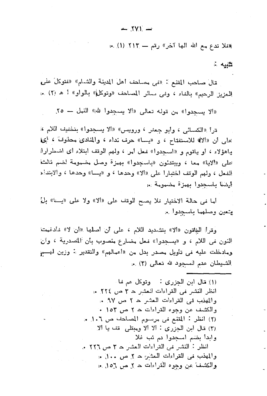 (¬4) قال ابن الجزري: ألا ألا ومبتلي قف يا ألا وابدأ بضم اسجدوا دم ثب غلا انظر: النشر في القراءات العشر ح 3 ص 226. والمهذب في القراءات العشر ح 2 ص 100. والكشف عن وجوه القراءات ح 2 ص 156.