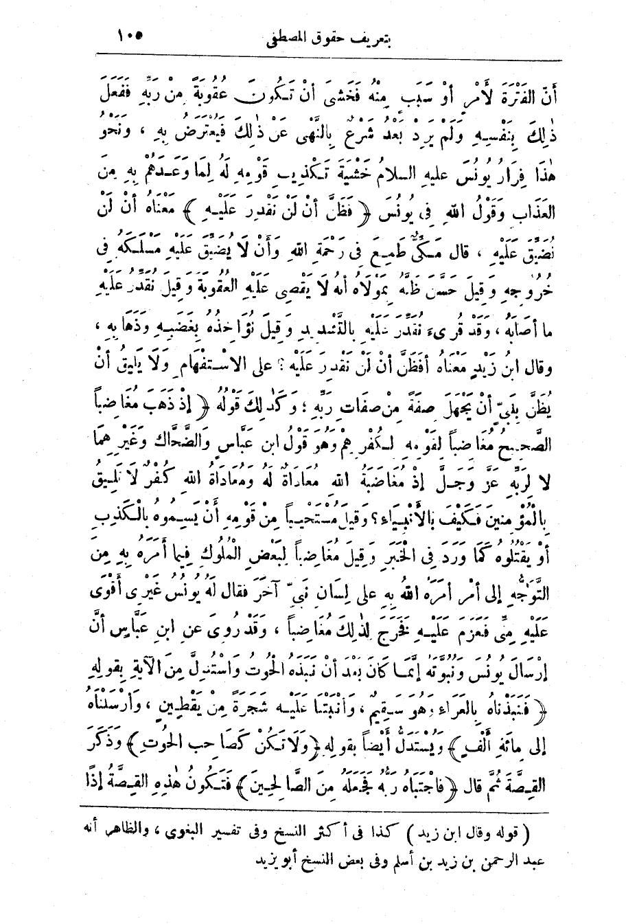 هذا فِرَار يُونُس عَلَيْه السَّلَام خَشيَة تَكْذِيب قَوْمِه لَه لَمّا وَعَدَهُم بِه مِن العَذَاب وقول اللَّه فِي يُونُس (فَظَنَّ أَنْ لَنْ نَقْدِرَ عليه) مَعْنَاهُ أن لَن نُضَيّق عَلَيْه، قَال مَكّيّ طَمِع فِي رَحِمَة اللَّه وَأَن لَا يُضَيّق عَلَيْه ملكه فِي خُرُوجِه وَقِيل حَسَّن ظَنَّه بِمَوْلاه أنَّه لا يقصى عَلَيْه العُقُوبَة وَقِيل نُقَدّر عَلَيْه مَا أصَابَه، وَقَد قُرِئ نُقَدّر عَلَيْه بِالتّشْدِيد وقيل نواحذه بِغَضَبِه وَذَهَابِه، وَقَال ابن زَيْد مَعْنَاه أفظن أن لَن نَقْدِر عَلَيْه؟ عَلَى الاسْتِفْهَام وَلَا يَلِيق أَن يُظَنّ بِنَبِيّ أَنّ يَجْهَل صفَة من صِفَات رَبّه، وَكَذَلِك قَوْله (إِذْ ذَهَبَ مغاضبا الصَّحِيح مُغَاضِبًا لِقَوْمِه لِكُفْرِهِم وَهُو قَوْل ابن عَبَّاس والضَّحَّاك وَغَيْرِهِمَا لَا لِرَبّه عَزّ وَجَلّ إِذ مُغَاضَبَة اللَّه مُعَادَاة لَه وَمَعادَاة اللَّه كفر لا لميق بِالْمُؤْمِنين فَكَيْف بِالْأَنْبِيَاء؟ وقيل مستحيبا من قومه أن يَسِمُوه بِالْكَذِب أَو يَقْتُلُوه كَمَا وَرَد فِي الْخَبَر وَقِيل مُغَاضِبًا لِبَعْض الْمُلُوك فِيمَا أَمَرَه بِه مِن التَّوَجُّه إِلَى أمر أمره اللَّه بِه عَلَى لِسان نَبِيّ آخر فَقَال لَه يُونُس غَيْرِي أقْوَى عَلَيْه مِنّي فَعَزَم عَلَيْه فَخَرَج لِذلِك مُغَاضِبًا، وَقَد رُوِي عَن ابن عَبَّاس أَنّ إرْسَال يُونُس وَنُبُوَّتَه إنَّمَا كَان بَعْد أَنْ نَبَذَه الْحُوت وَاسْتُدِلّ مِن الآيَة بِقَوْلِه (فَنَبَذْنَاهُ بِالْعَرَاءِ.