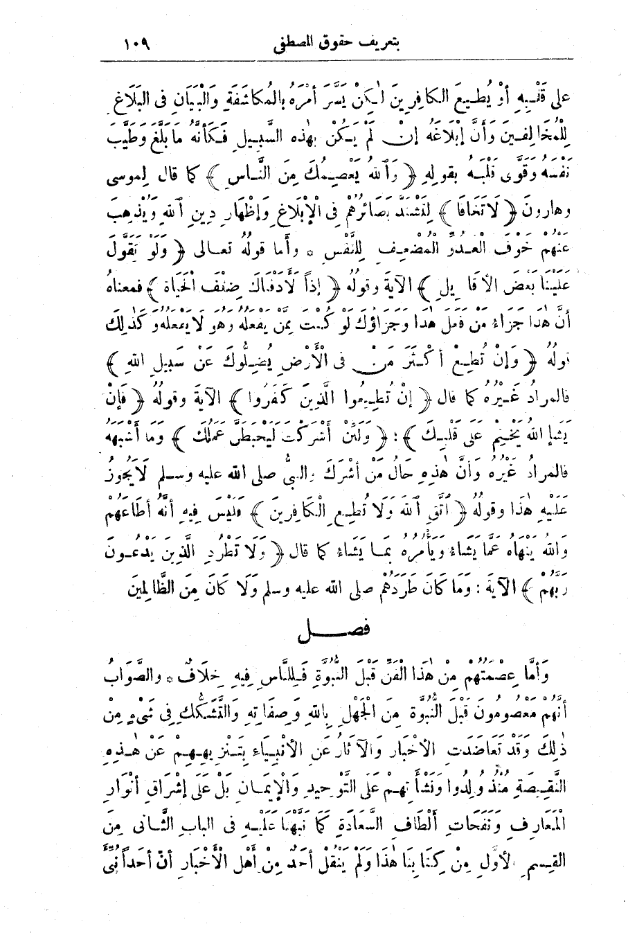 فصل وَأَمَّا عِصْمَتَهُم من هَذَا الْفَنّ قَبْل النُّبُوَّة فَلِلنَّاس فِيه خِلَاف * وَالصَّوَاب أَنَّهُم مَعْصُومُون قَبْل النُّبُوَّة مِن الْجَهْل بِالله وَصِفَاتِه وَالتَّشَكُك في شئ من ذَلِك وَقَد تَعَاضَدَت الْأَخْبَار وَالآثَار عَن الْأَنْبِيَاء بِتَنْزِيهِهِم عن هذه النقيصة مُنْذ وُلِدُوا وَنَشْأتِهِم عَلَى التَّوحْيد وَالْإِيمَان بَل عَلَى إشْرَاق أنوار المعارف نفحات أَلْطَاف السَّعَادَة كَمَا نبهنا عليه في الباب الثَّانِي مِن القِسِم الأَوَّل من كِتَابِنَا هَذَا وَلَم يَنْقُل أحَد من أهل الأخبار أن أحد النبي
