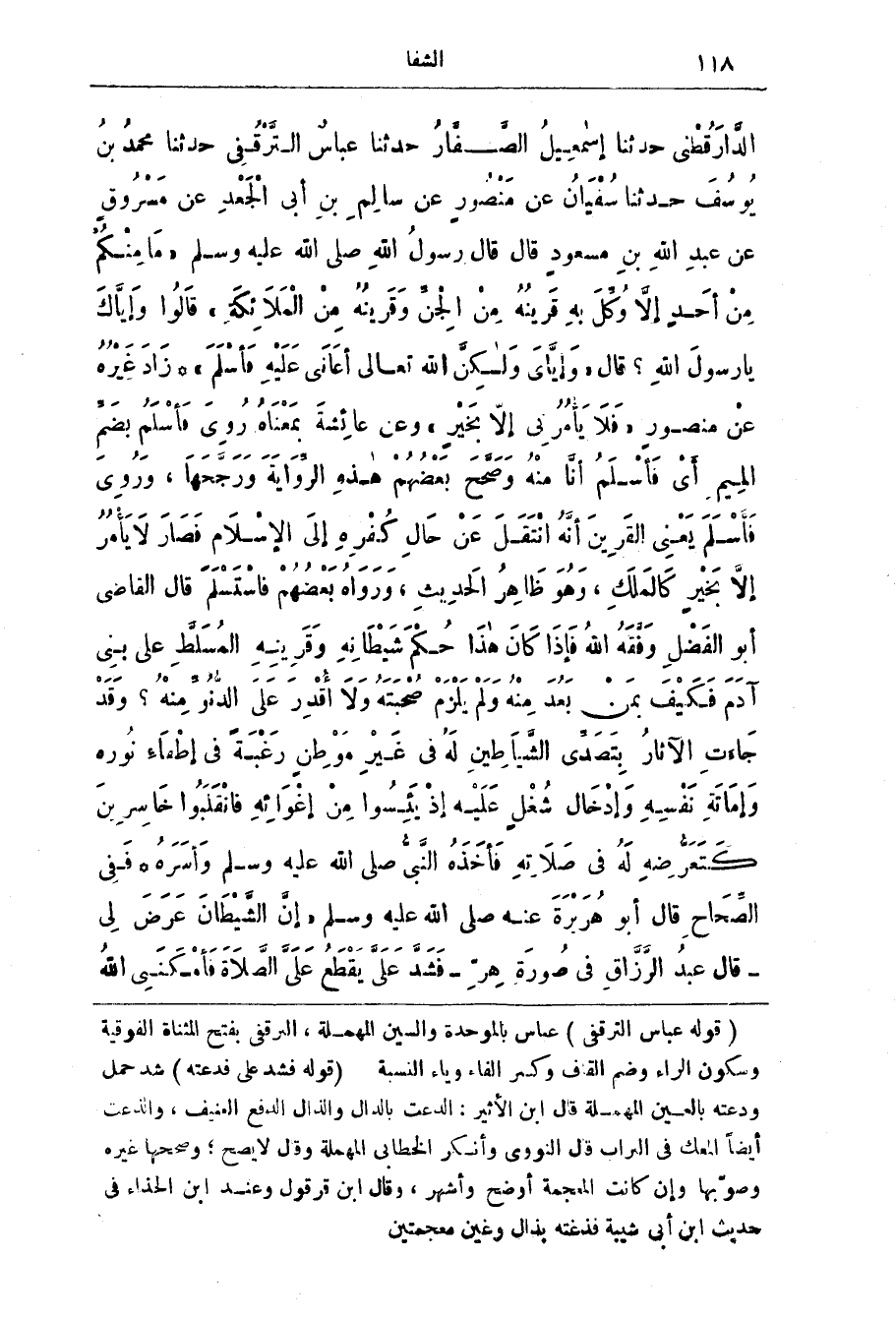 مِنْ أَحَدٍ إِلَّا وُكِّلَ بِهِ قَرِينُهُ مِنَ الْجِنِّ وَقَرِينُهُ مِنَ الْمَلَائِكَةِ) قَالُوا وَإِيَّاكَ يَا رَسُولَ اللَّهِ؟ قَالَ (وَإِيَّايَ وَلِكِنَّ اللَّهَ تعالى أعاني عَلَيْهِ فَأَسْلَمَ) * زَاد غَيْرِه عَن منصور (فَلَا يَأْمُرُنِي إِلَّا بِخَيْرٍ) وَعَن عَائِشَة بمعناه رُوِي فَأسْلَم بِضَم المِيم أَي فَأسْلَم أَنَا مِنْه وَصَحَّح بَعْضُهُم هَذِه الرَّوَايَة وَرَجَّحَهَا، وَرُوي فَأسْلَم يعني القَرِين أنَّه انْتَقَل عَن حَال كُفْرِه إِلَى الْإِسْلَام فَصَار لَا يَأْمُر إلَّا بِخَيْر كَالمَلك، وَهُو ظَاهِر الْحَدِيث، وَرَوَاه بَعْضُهُم فَاسْتَسْلَم قَال الْقَاضِي أَبُو الْفَضْل وَفَّقَه اللَّه فَإِذَا كَان هَذَا حُكْم شَيْطَانِه وقرينه المسلط عَلَى بَنِي آدَم فَكَيْف بِمَن بَعْد مِنْه وَلَم يَلْزَم صُحْبَتَه وَلَا أُقْدِر عَلَى الدُّنُوّ مِنْه؟ وَقَد جَاءَت الآثار بِتَصَدّي الشَّيَاطِين لَه في غير موطن رغبة في إطماء نُوره وَإماتَة نَفْسِه وَإدْخَال شُغْل عَلَيْه إِذ يئِسُوا من إغْوَائِه فانْقَلبُوا خَاسِرين كَتَعَرُّضِه لَه فِي صَلَاتِه فَأخَذَه النَّبِيّ صَلَّى اللَّه عَلَيْه وَسَلَّم وَأسَرَه * فَفِي الصَّحَاح قَال أَبُو هُرَيْرَة عَنْه صَلَّى اللَّه عَلَيْه وَسَلَّم (إِنَّ الشَّيْطَانَ عَرَضَ لِي - قَال عبد الرَّزَّاق فِي صُورَةِ؟ ؟ ؟ - فَشَدَّ عَلَيَّ يَقْطَعُ عَلَيَّ الصَّلَاةَ فَأَمْكنِنِي اللَّهُ