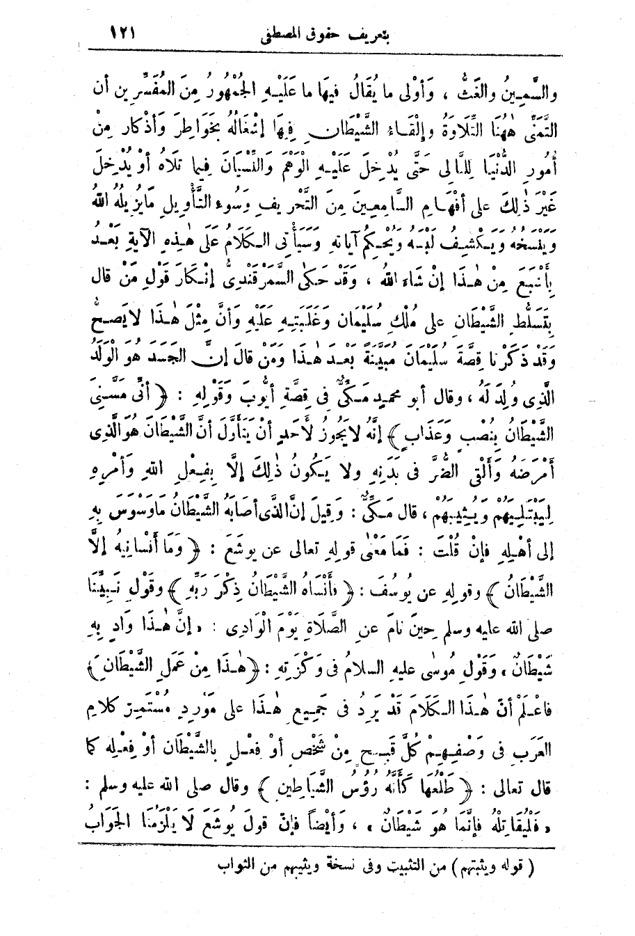 التمنى ههُنَا التَّلاوَة وَإلْقَاء الشَّيْطَان فِيهَا إشْغَاله بِخَوَاطِر وَأذَكَار من أمور الدنيا لليالي حَتَّى يُدْخِل عَلَيْه الْوَهْم وَالنّسْيَان فِيمَا تَلاه أَو يُدْخِل غَيْر ذَلِك عَلَى أفهَام السَّامِعِين مِن التحريف وَسُوء التَّأوِيل مَا يُزِيلُه اللَّه وَيَنْسَخُه وَيَكْشِف لَبْسَه وَيُحْكم آياتِه وَسَيَأتَي الْكَلَام عَلَى هَذِه الآيَة بعد بِأشْبَع من هَذَا إن شَاء اللَّه، وَقَد حكى السَّمْرَقَنْدِيّ إنْكَار قَوْل من قال بتسلط الشَّيْطَان عَلَى مُلْك سليمان وغلبته عليه وَأَنّ مِثْل هَذَا لَا يَصحّ وَقَد ذَكَرْنا قِصَّة سُلَيْمَان مُبَيَنَة بَعْد هَذَا وَمِن قَال إنّ الجَسَد هُو الوَلَد الَّذِي وُلِد لَه، وَقَال أَبُو مُحَمَّد مَكّيّ فِي قِصَّة أيُّوب وَقَوْلُه: (أَنِّي مَسَّنِيَ الشَّيْطَانُ بِنُصْبٍ وعذاب) أنه لا يجوز لأحد أن ينازل أَنّ الشَّيْطَان هُو الَّذِي أمْرَضه وَألْقَى الضُّرّ فِي بَدَنِه ولا يَكُون ذَلِك إلَّا بِفِعْل اللَّه وَأمْرِه لِيَبْتَلِيَهُم وَيُثِيبهُم.
