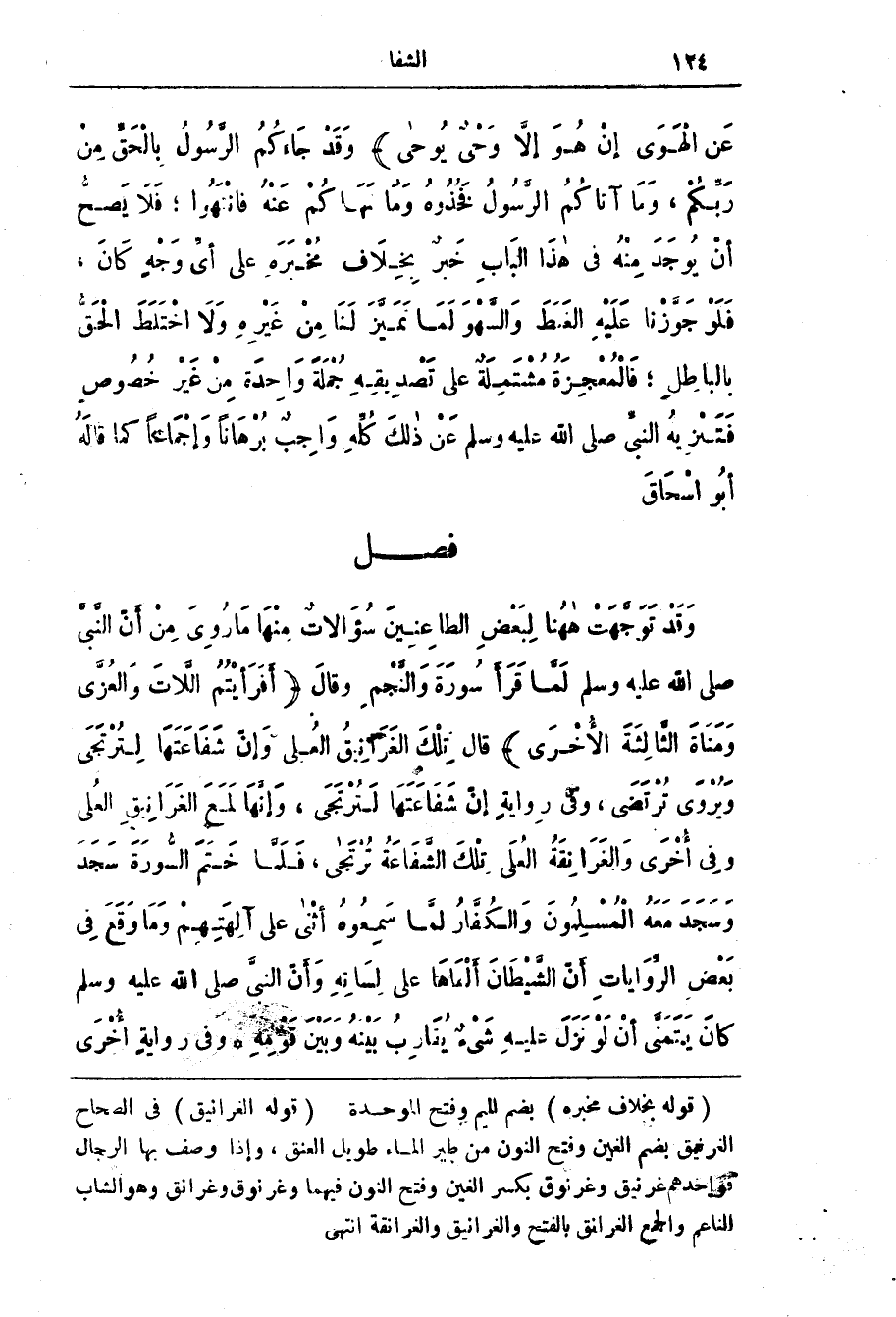فصل وَقَد تَوَجَّهَت ههُنا لِبَعْض الطاعِنِين سُؤَالات مِنْهَا مَا رُوِي من أَنّ النَّبِيّ صلى الله عليه وسلم لما قرأ سورة وَالنَّجْم وَقَال (أَفَرَأَيْتُمُ اللَّاتَ وَالْعُزَّى وَمَنَاةَ الثَّالِثَةَ الأخرى) قَال تِلْك الغَرَانِيق العُلى وَإِنّ شَفَاعَتَهَا لِتُرْتَجى وَيُرْوَى تُرْتَضَى، وَفِي رِوَايَة إن شَفَاعَتَهَا لَتُرْتَجَى، وأنها لَمَع الغَرَانِيق العُلى وَفِي أُخْرَى وَالغَرَانِقَة العُلَى تِلْك الشَّفَاعَة تُرْتَجى، فَلَمّا خَتَم السُّورَة سَجَد وَسَجَد مَعَه الْمُسْلِمُون وَالكُفَّار لَمّا سَمِعُوه أثْنى عَلَى آلِهتِهِم وَمَا وقَع فِي بَعْض الروايات أَنّ الشَّيْطَان ألفاها عَلَى لِسَانِه وَأَنّ النَّبِيّ صَلَّى اللَّه عَلَيْه وَسَلَّم كَان يَتَمَنَّى أَنّ لَو نَزَل عَلَيْه شئ يُقَارِب بَيْنَه وَبَيْن قَوْمِه * وَفِي رِوَايَة أُخْرَى