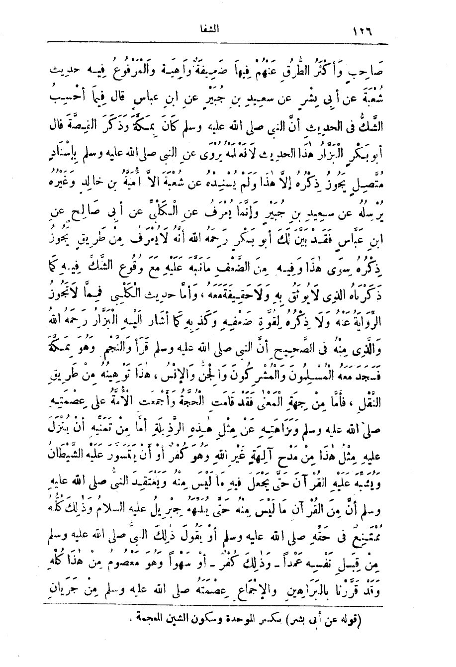 ذِكْرُه سِوَى هَذَا وَفِيه مِن الضَّعْف مَا نَبَّه عَلَيْه مَع وُقُوع الشك فِيه كَمَا ذَكَرَنَاه الَّذِي لَا يُوثَق بِه وَلَا حَقِيقَة مَعَه، وَأَمَّا حَدِيث الْكَلْبِي فمِمَّا لَا تَجُوز الرَّواية عَنْه وَلَا ذِكْرُه لِقُوَّة ضَعْفِه وَكَذِبِه كَمَا أشَار إليْه الْبَزَّار رَحِمَه اللَّه وَالَّذِي مِنْه فِي الصحيح أن النبي صلى الله عليه وَسَلَّمَ قَرَأَ وَالنَّجْمِ وَهُوَ بِمَكَّةَ فَسَجَدَ مَعَهُ الْمُسْلِمُونَ وَالْمُشْرِكُونَ وَالْجِنُّ وَالإِنْسُ، هَذَا تَوْهِينُهُ مِنْ طَرِيقِ النَّقْلِ، فَأَمَّا من جِهة الْمَعْنَى فَقَد قَامَت الْحُجَّة وَأَجْمَعت الأُمَّة عَلَى عِصْمَتِه صَلَّى اللَّه عليه وَسَلَّم وَنَزَاهِتِه عَن مثل هذه الرذبلة إِمَّا من تَمَنَّيه أن يُنْزَل عَلَيْه مِثْل هَذَا من مَدْح آلِهة غَيْر اللَّه وَهُو كُفْر أَو أن يَتَسَوَّر عَلَيْه الشَّيْطَان وَيُشَبَّه عَلَيْه الْقُرْآن حَتَّى يَجْعل فِيه مَا لَيْس مِنْه وَيَعْتقَد النَّبِيّ صَلَّى اللَّه عَلَيْه وَسَلَّم أَنّ مِن الْقُرْآن مَا لَيْس مِنْه حَتَّى يُنَبّهَه جِبْرِيل عَلَيْه السَّلَام وَذَلِك كُلُّه مُمْتَنِع فِي حَقَّه صَلَّى اللَّه عَلَيْه وَسَلَّم أَو يَقُول ذَلِك النَّبِيّ صَلَّى اللَّه عَلَيْه وَسَلَّم من قِبَل نَفْسِه عَمْدًا - وَذَلِك كُفْر - أَو سَهْوًا وهو مَعْصُوم من هَذَا كله وَقَد قَرَّرْنا بِالبَرَاهِين وَالإجْماع عِصْمَتَه صَلَّى اللَّه عَلَيْه وَسَلَّم من جَرَيان