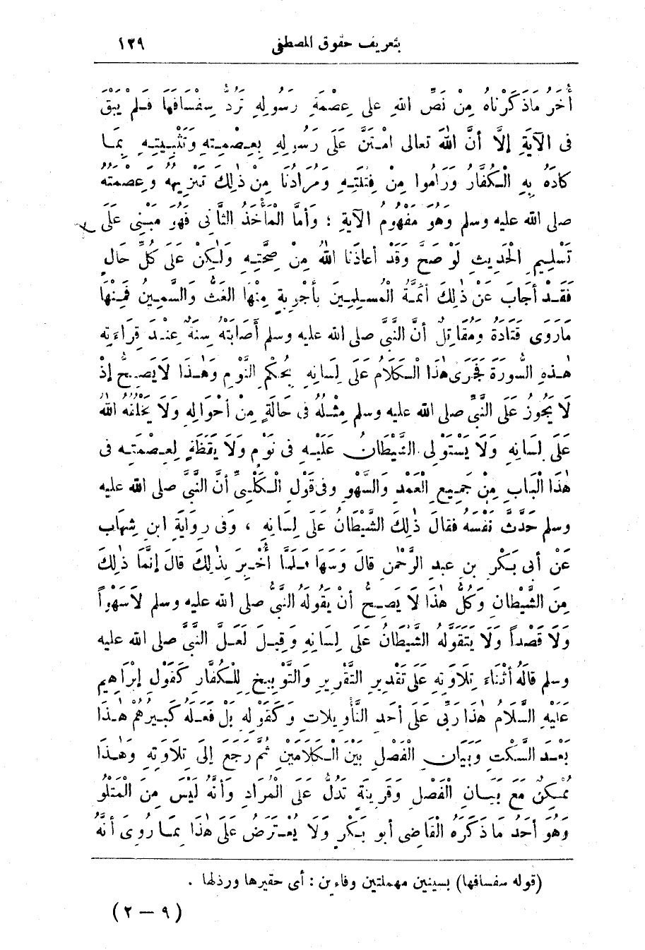 أُخَر مَا ذَكَرَناه من نص اللَّه عَلَى عِصْمَة رسوله تَرُدّ سِفْسافَهَا فَلَم يَبْق فِي الآيَة إلَّا أَنّ اللَّه تَعَالَى امْتَنّ عَلَى رسوله بِعِصْمِتِه وتَثْبِيتِه بِمَا كادَه بِه الكُفَّار وَرَامُوا من فِتْنَتِه وَمُرَادُنَا من ذَلِك تَنْزِيهُه وَعِصْمَتُه صَلَّى اللَّه عَلَيْه وَسَلَّم وَهُو مَفْهُوم الآيَة، وَأَمَّا المَأْخَذ الثاني فَهُو مَبْنِي عَلَى تَسِليم الْحَدِيث لَو صَحّ وَقَد أعاذَنا اللَّه من صِحَّتِه وَلَكِن عَلَى كُلّ حَال فَقَد أجَاب عَن ذَلِك أئمة الْمُسْلِمِين بأجْوبة مِنْهَا الغَثّ وَالسَّمِين فَمِنْهَا مَا رَوَى قَتَادَة وَمُقَاتِل أَنّ النَّبِيّ صَلَّى اللَّه عَلَيْه وَسَلَّم أصَابَتْه سِنَة عِنْد قِرَاءَتِه هَذِه السُّورَة فَجَرَى هَذَا الْكَلَام عَلَى لِسَانِه بِحُكْم النَّوْم وَهَذَا لَا يَصِحّ إِذ لَا يَجُوز عَلَى النَّبِيّ صَلَّى اللَّه عَلَيْه وَسَلَّم مِثْلُه فِي حَالَة من أحْوالِه وَلَا يَخْلُقُه اللَّه عَلَى لِسَانِه وَلَا يَسْتَوْلِي الشَّيْطَان عَلَيْه فِي نَوْم وَلَا يَقَظَة لِعِصْمَتِه فِي هَذَا الْبَاب من جَمِيع الْعَمْد وَالسَّهْو وَفِي قَوْل الْكَلْبِيّ أَنّ النَّبِيّ صَلَّى اللَّه عَلَيْه وَسَلَّم حَدَّث نَفْسَه فَقَال ذَلِك الشَّيْطَان عَلَى لِسَانِه، وَفِي رِوَايَة ابن شِهَاب عَن أَبِي بَكْر بن عَبْد الرَّحْمن قَال وَسَهَا فَلَمّا أُخْبِر بِذَلِك قَال إنَّمَا ذَلِك مِن الشَّيْطَان وَكُلّ هذه لَا يَصِحّ أن يَقُولَه النَّبِيّ صَلَّى اللَّه عَلَيْه وَسَلَّم لَا سَهْوًا وَلَا قَصْدًا وَلَا يَتَقَوَّلِه الشَّيْطَان عَلَى لِسَانِه وَقِيل لَعَلّ النَّبِيّ صَلَّى اللَّه عَلَيْه وَسَلَّم قالَه أثْنَاء تِلاوَتِه عَلَى تَقْدِير التَّقْرِير وَالتَّوْبِيخ لِلْكُفّار كقَوْل إبْرَاهِيم عَلَيْه السَّلَام هَذَا رَبِّي عَلَى أَحَد التَّأْوِيلات وَكَقَوْلِه بَلْ فَعَلَهُ كَبِيرُهُمْ هذا بَعْد السَّكُت وَبَيَان الْفَصل بَيْن الْكَلامَيْن ثُمّ رَجَع إِلَى تلاوته وهذا يمكن مَع بَيَان الْفَصل وَقَرِينَة تَدُلّ عَلَى الْمُرَاد وَأنَّه لَيْس مِن الْمَتْلُو وَهُو أَحَد مَا ذَكَرَه الْقَاضِي أَبُو بَكْر وَلَا يُعْتَرَض عَلَى هَذَا بِمَا رُوِي أنه