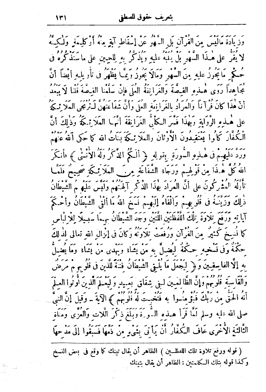 وَزِيَادَة مَا لَيْس مِن القرآن بَل السَّهْو عن إسقاط آية منه أو كلمة ولكنه لا يقر على هذا السهو بَل يُنَبَّه عَلَيْه وَيُذَكَّر بِه لِلحِين عَلَى مَا سَنَذْكُرُه فِي حُكْم مَا يَجُوز عَلَيْه مِن السهو وَمَا لَا يَجُوز وَمِمَّا يَظْهَر فِي تأْويلِه أيْضًا أَنّ مُجَاهِدًِا رَوَى هَذِه الْقِصَّة وَالغَرَانِقَة العُلَى فإن سَلَّمْنا الْقِصَّة قُلْنَا لَا يَبْعُد أَنّ هَذَا كَان قُرْآنًا وَالمُرَاد بِالْغَرانِقَةِ الْعُلَى وأن شفاعتهن لتربحي الْمَلَائِكَة عَلَى هَذِه الرّوَايَة وبهذا فَسَّر لكلى الغَرَانِقَة أنَّهَا الْمَلَائِكَة وذلك أن الكفار كانوا يعتقدون الْأَوثَان وَالْمَلَائِكَة بَنَات اللَّه كَمَا حَكى اللَّه عَنْهُم