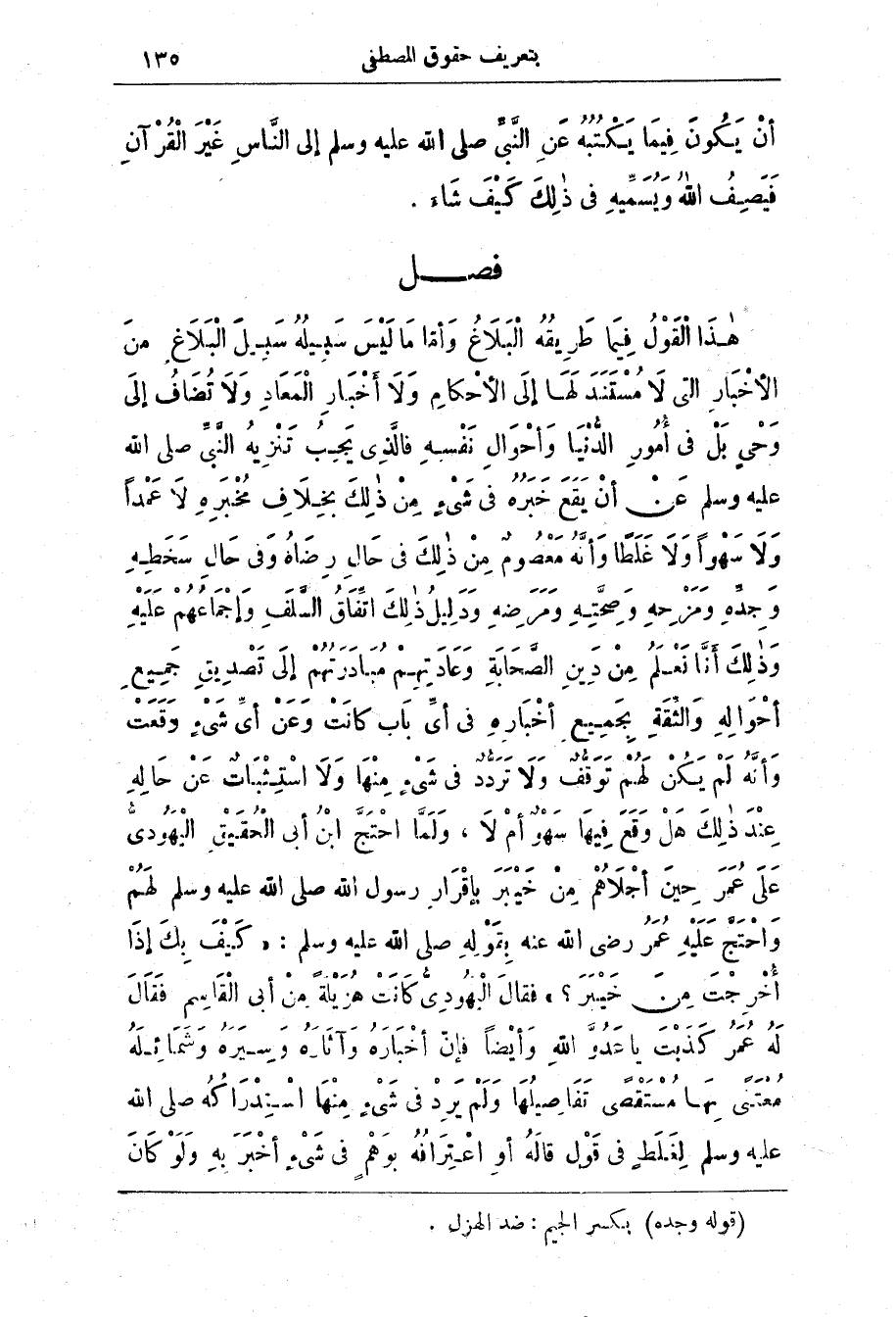 فصل هَذَا القول فِيمَا طَرِيقُه الْبَلَاغ وَأَمَّا مَا لَيْس سبيله سبيل الْبَلَاغ مِن الْأَخْبَار التي لَا مُسْتَند لَهَا إِلَى الأحْكام وَلَا أَخْبَار الْمعَاد وَلَا تُضَاف إِلَى وَحْي بَل فِي أُمُور الدُّنْيَا وَأحْوَال نَفْسِه فالَّذِي يَجِب تَنْزِيه النَّبِيّ صَلَّى اللَّه عَلَيْه وَسَلَّم عَن أن يَقَع خَبَرُه فِي شئ من ذَلِك بِخِلَاف مُخْبَرِه لَا عَمْدًا