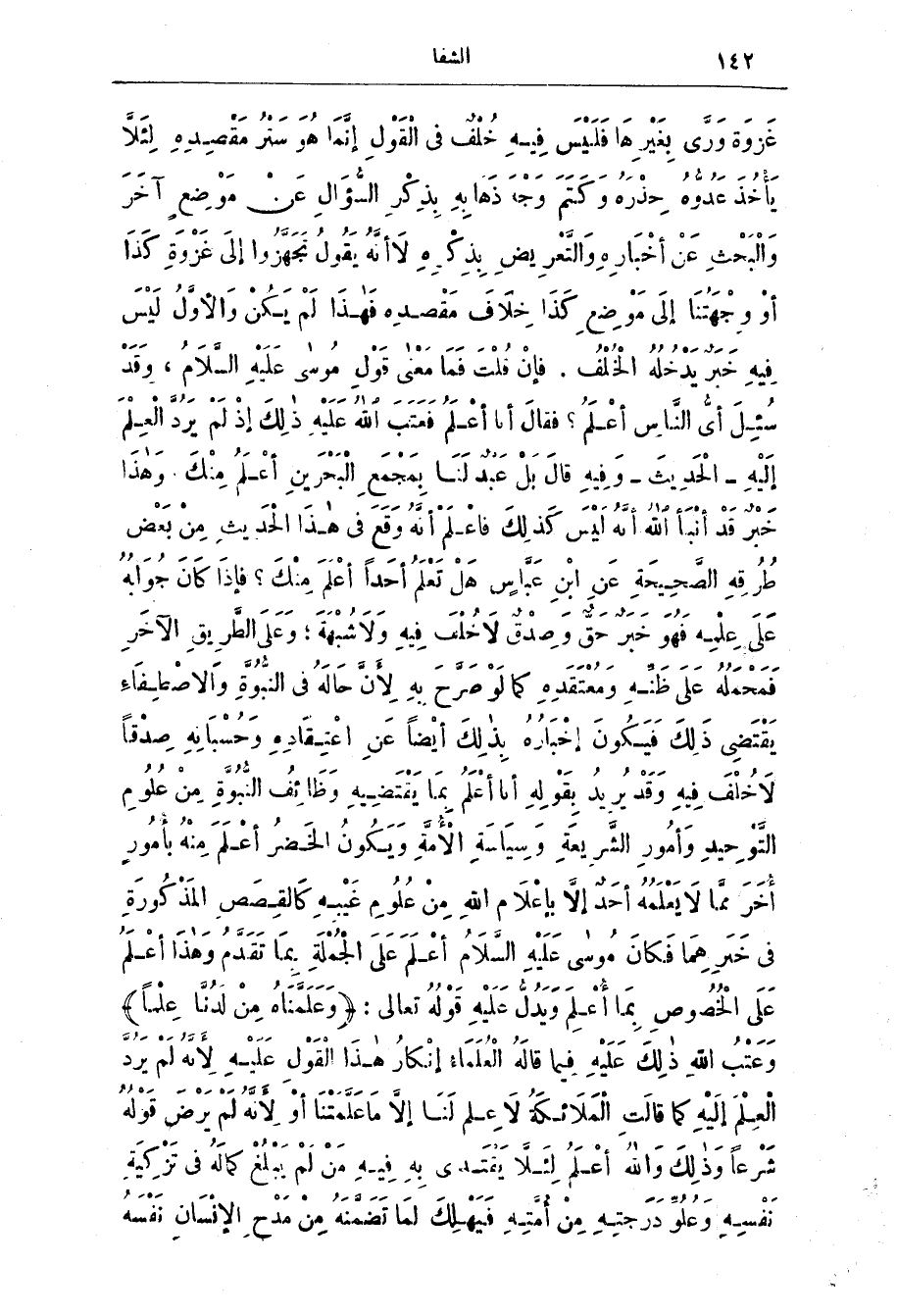 خبر قد أنبأ اللَّه أنه ليس كذلك فاعلم أنه وقع في هذا الحديث من بعض طرقه الصَّحِيحَة عَن ابن عَبَّاس هَل تَعْلَم أحَدًا أعْلَم مِنْك؟ فَإِذَا كَان جُوَابُه عَلَى عِلْمِه فَهُو خَبَر حَق وَصِدْق لَا خُلْف فِيه ولا شبهة، وعلى الطريق الآخر فمحمله على ظنه ومعتقده كما لو صرح به لأن حاله في النبوة والاصطفاء يقتضي ذلك فيكون إخباره بذلك أيضا عن اعتقاده وحسبانه صدقا لَا خُلْف فِيه وَقَد يُرِيد بِقَوْلِه أَنَا أعْلَم بِمَا يَقْتَضِيه وَظَائِف النُّبُوَّة من عُلُوم التَّوْحِيد وَأمُور الشَّرِيعَة وَسِيَاسَة الْأُمَّة وَيَكُون الخَضر أَعْلَم مِنْه بِأُمُور أخَر مِمَّا لَا يَعْلَمُه أحَد إلَّا بإعْلام اللَّه من عُلُوم غَيْبِه كَالقِصَص المَذْكُورَة فِي خَبَرِهِمَا فكان مُوسَى عَلَيْه السَّلَام أعْلَم عَلَى الْجُمْلَة بِمَا تَقَدَّم وَهَذَا أَعْلَم عَلَى الْخُصُوص بِمَا أُعْلِم وَيَدُلّ عَلَيْه قَوْله تَعَالَى: (وَعَلَّمْنَاهُ مِنْ لدنا علما) وَعَتْب اللَّه ذَلِك عَلَيْه فِيمَا قَالَه الْعُلمَاء إنْكَار هَذَا القَوْل عَلَيْه لِأَنَّه لَم يَرُدّ الْعِلْم إليه كَمَا قَالَت الْمَلَائِكَة لَا عِلم لَنَا إلَّا مَا عَلَّمْتنَا أو لِأَنَّه لَم يَرْض قَوْله شَرْعًا وَذَلِك والله أعْلَم لِئَلَّا يَقْتَدي بِه فِيه من لَم يَبْلُغ كماله فِي تَزْكِيَة نَفْسِه وَعُلُوّ دَرَجته من أمَّتَه فَيَهْلِك لَمّا تَضَمَّنَه من مَدْح الْإِنْسَان نَفْسَه