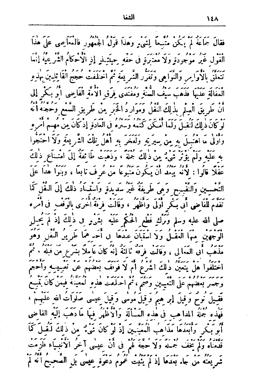 فَقَال جَمَاعَة لم يكن متبعا لشئ وَهَذَا قَوْل الجُمْهُور فالْمَعَاصِي عَلَى هَذَا الْقَوْل غَيْر مَوْجُودَة وَلَا مُعْتَبَرَة فِي حَقَّه حِينَئذ إِذ الْأَحْكَام الشَّرْعِيَّة إنَّمَا تتعلق بالأوامر وَالنَّوَاهِي وَتَقَرُّر الشَّرِيعَة ثم احتلفت حُجَج الْقَائِلِين بِهَذِه الْمَقَالَة عَلَيْهَا فَذَهَب سَيْف السُّنَّة وَمُقْتَدَى فِرَق الْأُمَّة الْقَاضِي أَبُو بَكْر إِلَى أن طَرِيق الْعِلْم بِذَلِك النَّقْل وَمَوَارِد الخَبَر من طريق السَّمْع وَحُجَّتُه أنَّه لَو كان ذَلِك لَنُقل ولما أمْكَن كَتْمُه وَسَتْرُه فِي الْعَادَة إِذ كَان من مُهِمّ أَمْرِه وَأَوْلى مَا اهْتُبِل بِه من سِيرَتِه وَلَفَخَر بِه أَهْل تِلْك الشَّريعَة وَلَا احْتَجّوا بِه عَلَيْه ولم يؤثر شئ من ذَلِك جُمْلَة، وَذَهبَت طَائِفَة إِلَى امْتنَاع ذَلِك