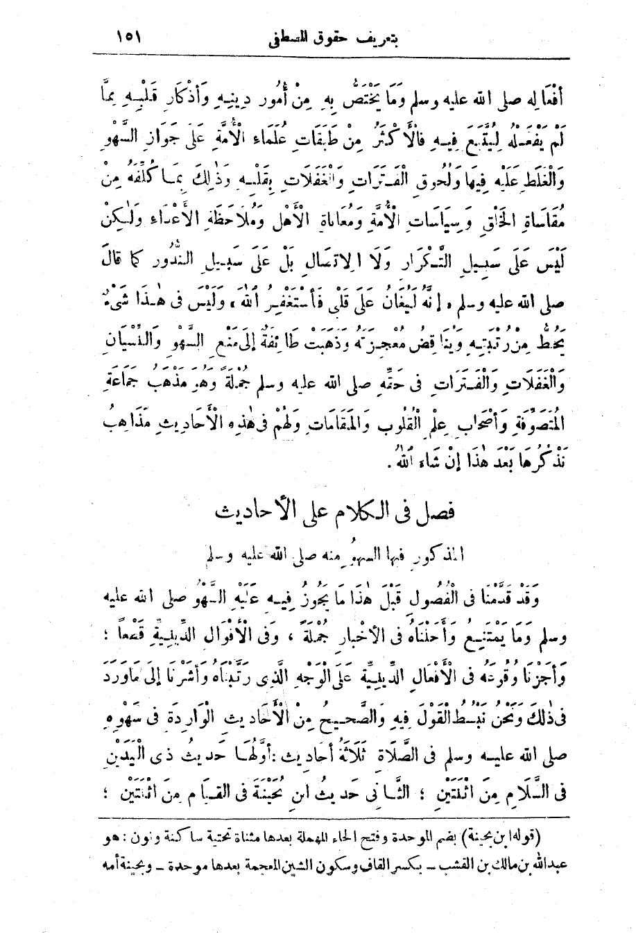 فصل فِي الْكَلَام عَلَى الْأَحَادِيث المذكور فِيهَا السهو مِنْه صَلَّى اللَّه عَلَيْه وَسَلَّمَ وَقَد قَدَّمْنَا فِي الْفُصُول قَبْل هَذَا مَا يَجُوز فِيه عَلَيْه السَّهْو صَلَّى اللَّه عَلَيْه وَسَلَّم وَمَا يَمْتَنِع وَأَحَلْنَاه فِي الْأَخْبَار جُمْلَة، وَفِي الأقْوَال الدينية قَطْعًا، وَأجزْنَا وَقُوعَه فِي الْأَفْعَال الدّينِية عَلَى الْوَجْه الَّذِي رَتَّبْنَاه وَأشَرْنَا إلى مَا وَرَد فِي ذَلِك وَنَحْن نَبْسُط القَوْل فِيه الصحيح مِن الْأَحَادِيث الْوَارِدَة فِي سَهْوِه صَلَّى اللَّه عَلَيْه وَسَلَّم فِي الصَّلَاة ثَلَاثَة أحاديث: أولها حديث ذي الْيَدَيْن فِي السَّلَام مِن اثْنَتَيْن، الثَّاني حَدِيث ابن بحينة في القام من اثنتين،