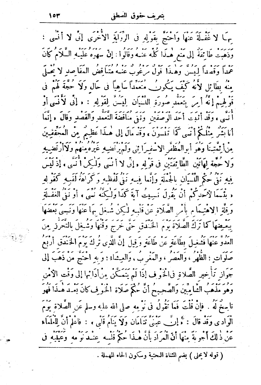بِهَا لَا غَفْلَة عَنْهَا وَاحْتَجّ بِقَوْلِه فِي الرّوَايَة الْأُخْرَى إني لَا أنْسى، وَذَهَبَت طَائِفَة إِلَى مَنْع هَذَا كُلّه عَنْه وقالوا: إنّ سَهْوَة عَلَيْه السَّلَام كَان عَمْدًا وَقَصْدًا لِيَسُنّ وَهَذَا قَوْل مَرْغُوب عَنْه مُتَنَاقِض المَقَاصِد لَا يُحْلَى مِنْه بِطائِل لِأَنَّه كَيْف يَكُون مُتَعْمّدًا سَاهِيًا فِي حَال وَلَا حُجَّة لَهُم فِي قَوْلِهِم إنَّه أمِر بِتَعَمُّد صُورَة النّسْيَان ليَسُنّ لِقَوْلِه: (إِنِّي لأَنْسَى أَوْ أنسى) وقد أثبت أَحَد الوصفين وَنَفَى مناقضة التَّعَمُّد وَالقَصْد وَقَال (إِنَّمَا أَنَا بَشَرٌ مِثْلُكُمْ أَنْسَى كَمَا تَنْسَوْنَ) وَقَد مال إِلَى.