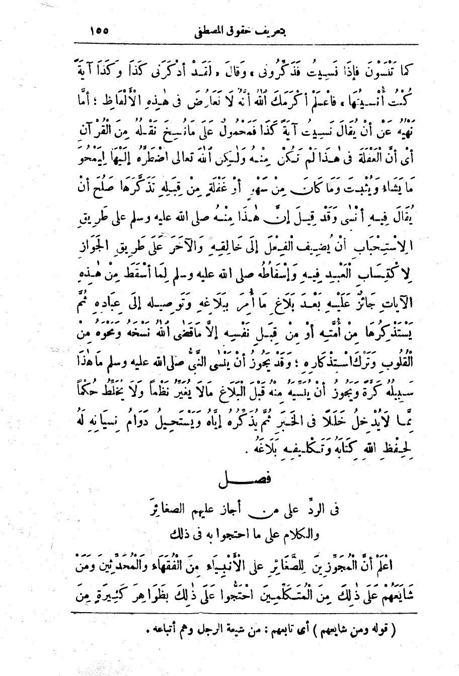 فصل فِي الرد عَلَى من أجاز عَلَيْهِم الصغائر والكلام عَلَى ما احتجوا بِه فِي ذَلِك اعْلَم أن الْمُجَوّزِين لِلصَّغَائِر عَلَى الْأَنْبِيَاء مِن الْفُقَهَاء وَالْمُحَدّثِين وَمِن شَايَعَهُم عَلَى ذَلِك مِن الْمُتَكَلَّمِين احْتَجُّوا عَلَى ذَلِك بِظوَاهِر كَثِيرَة مِن
