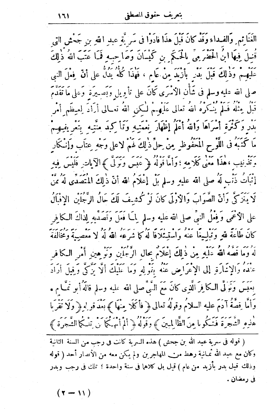 الغنائم وَالفداء وَقَد كان قبل هَذَا فادَوْا فِي سرية عَبْد اللَّه بن جَحْش التي قُتِل فِيهَا ابن الْحَضْرَمِيّ بِالْحَكَم بن كَيْسَان وَصَاحِبِه فَمَا عَتَب الله عليهم وذلك قبل بَدْر بأزْيَد من عَام، فهذا كله يَدُلّ عَلَى أن فِعْل النَّبِيّ صَلَّى اللَّه عَلَيْه وَسَلَّم فِي شَأْن الأسْرَى كَان عَلَى تأوِيل وَبَصِيرَة وَعَلَى مَا تَقَدّم قَبْل مِثْلُه فَلَم ينكره اللَّه تَعَالَى عَلَيْهِم لَكِن اللَّه تَعَالَى أرَاد لِعِظَم أمْر بَدْر وَكَثْرَة أسْرَاهَا والله اعْلَم إظَهَار نِعْمَتِه وَتَأكِيد منَّتِه بِتَعْرِيفهِم مَا كَتَبَه فِي اللَّوْح الْمَحْفُوظ من حِلّ ذَلِك لَهُم لَا عَلَى وَجه عِتَاب وَإنْكَار وَتَذْنِيب، هَذَا مَعْنَي كلامه، وَأَمَّا قَوْله (عَبَسَ وَتَوَلَّى) الآيات فَلَيْس فِيه إثْبَات ذَنْب لَه صَلَّى اللَّه عَلَيْه وَسَلَّم بَل إعْلَام اللَّه أَنّ ذَلِك المُتَصَدّي لَه مِمَّن لَا يَتَزَكَّى وأن الصَّوَاب وَالأوْلَى كَان لَو كُشِف لَك حَال الرَّجُلَيْن الإقْبَال عَلَى الأعْمَى وَفِعْل النَّبِيّ صَلَّى اللَّه عَلَيْه وَسَلَّم لَمّا فَعَل وَتَصَدّيه لِذاك الكافر كان طَاعَة لله وتَبْلِيغًا عَنْه وَاسْتِئْلَافًا لَه كَمَا شَرَعَه اللَّه لَه لَا مَعْصِيَة وَمُخَالَفَة لَه وَمَا قِصَّة اللَّه عَلَيْه من ذَلِك إعْلَام بِحال الرَّجُلَيْن وتَوْهِين أمر الكافِر