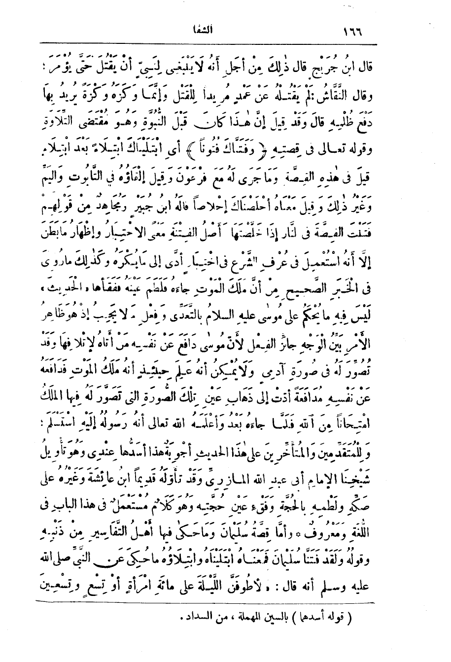 وَلِلْمُتَقَدّمِين وَالمُتأخَرِين عَلَى هَذَا الْحَدِيث أجْوِبَة هَذَا أسَدُّها عِنْدِي وَهُو تَأْوِيل شَيْخِنَا الْإِمَام أَبِي عَبْد اللَّه المازِرِيّ وَقَد تَأوَّلَه قَدِيمًا ابن عَائِشَة وَغَيْرِه عَلَى صَكّه وَلَطْمِه بالحُجَّة وفقء عَيْن حُجَّتِه وَهُو كَلَام مُسْتَعْمَل فِي هذا الْبَاب فِي اللُّغَة وَمَعْرُوف * وَأَمَّا قِصَّة سُلَيْمَان وَمَا حَكى فِيهَا أَهْل التَّفَاسِير من ذَنْبِه وَقَوْلُه وَلَقَدْ فَتَنَّا سليمان فَمَعْنَاه ابْتَلَيْنَاه وابْتِلاؤُه مَا حُكِي عَن النَّبِيّ صَلَّى اللَّه عَلَيْه وَسَلَّم أنَّه قَال: (لأَطُوفَنَّ اللَّيْلَةَ عَلَى مِائَةِ امْرَأَةٍ أَوْ تِسْعٍ وَتِسْعِينَ