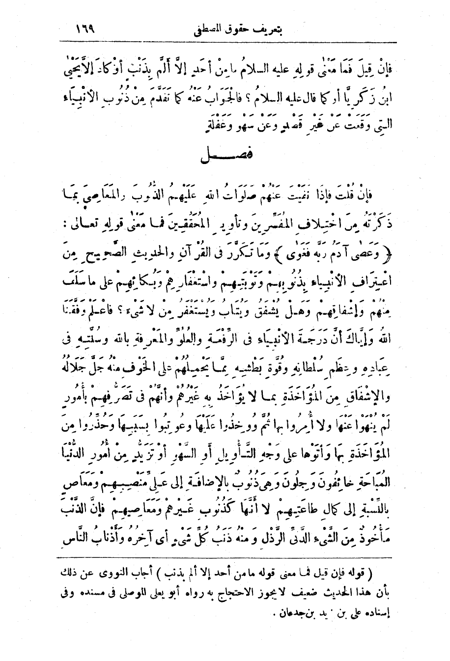 فصل فَإِن قُلْت فَإِذَا نَفيْت عَنْهُم صَلَوَات اللَّه عَلَيْهِم الذُّنُوب والمَعَاصِي بِمَا ذَكَرَتَه مِن اخْتِلَاف الْمُفَسّرِين وَتأوِيل المحققين فَمَا مَعْنَي قَوْله تَعَالَى: (وَعَصَى آدَمُ رَبَّهُ فغوى) وَمَا تكرر فِي الْقُرْآن والحديث الصَّحِيح مِن اعْتِرَاف الْأَنْبِيَاء بذنوبهم وتوبتهنم وَاسْتِغْفَارِهِم وَبُكائِهِم عَلَى ما سلف منهم وَإشْفاقِهِم وَهَل يُشْفَق وَيُتَاب وَيُسْتَغْفَر من لَا شئ؟ فاعلم وفقنا اللَّه وَإيَّاك أن دَرَجَة الْأَنْبِيَاء فِي الرّفْعَة وَالعُلُوّ والمعرفة بالله وَسُنَّتِه فِي عبادة وعظم سلطانه وقوة بطشه مِمَّا يحملهم عَلَى الخوف مِنْه جل جلاله والإشفاق مِن المؤاخذة بِمَا لَا يؤاخذ بِه غَيْرِهِم وَأَنَّهُم فِي تصرفهم بأمور لَم ينهوا عَنْهَا وَلَا أمروا بِهَا ثُمّ ووخذوا عَلَيْهَا وعوتبوا بسببها وحذروا مِن المؤاخذة بِهَا وأتوها على وجه التأويل أَو السَّهْو أَو تزيد من أمور الدنيا المباحة خائفون وجلون وَهِي ذنوب بالإضافة إِلَى عَلِيّ منصبهم ومعاص بالنسبة إِلَى كمال طاعتهم لَا أنَّهَا كَذُنُوب غَيْرِهِم ومَعَاصِيهِم فَإِنّ الذنب مَأْخُوذ من الشئ الدنى الرَّذْل وَمِنْه ذَنَب كل شئ أَي آخِرُه وَأذْناب الناس