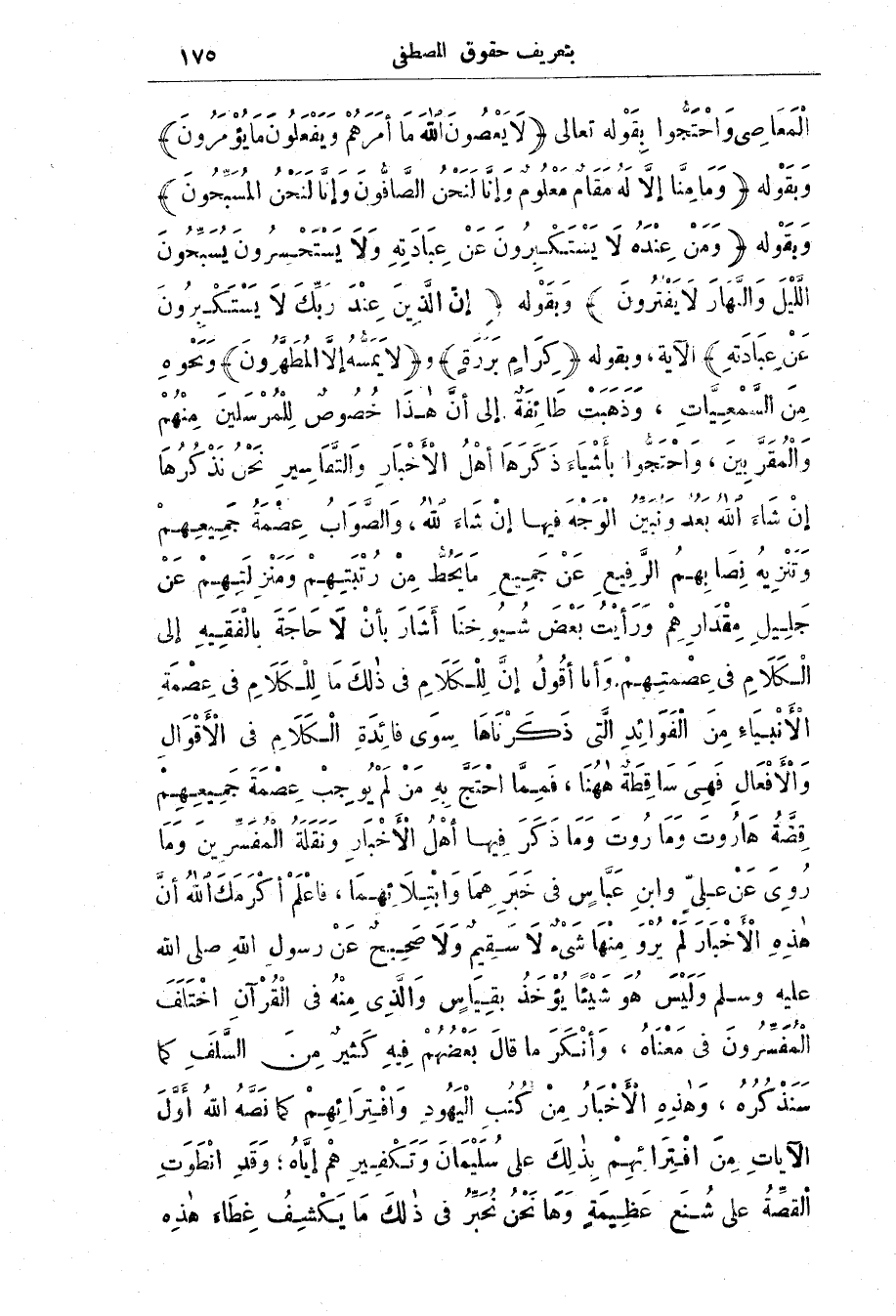 المعاصي واحتجُّوا بِقَوْلِه تَعَالَى (لا يَعْصُونَ اللَّهَ مَا أَمَرَهُمْ وَيَفْعَلُونَ مَا يُؤْمَرُونَ) وبقوله (وَمَا مِنَّا إِلا لَهُ مَقَامٌ مَعْلُومٌ وَإِنَّا لَنَحْنُ الصَّافُّونَ وَإِنَّا لَنَحْنُ الْمُسَبِّحُونَ) وبقوله (وَمَنْ عِنْدَهُ لا يَسْتَكْبِرُونَ عَنْ عِبَادَتِهِ وَلا يَسْتَحْسِرُونَ يُسَبِّحُونَ اللَّيْلَ وَالنَّهَارَ لا يفترون) وبقوله (إِنَّ الَّذِينَ عِنْدَ رَبِّكَ لا يَسْتَكْبِرُونَ عَنْ عبادته) الآية، وبقوله (كرام بررة) و (لا يَمَسُّهُ إِلا المطهرون) وَنَحْوَه مِن السَّمْعِيَّات، وذهبت طائفة إن أَنّ هَذَا خُصُوص لِلْمُرْسَلِين مِنْهُم وَالمُقَرَّبِين، واحْتَجُّوا بأشْيَاء ذَكَرَهَا أهْل الْأَخْبَار والتَّفَاسِير نَحْن نَذْكُرُهَا إن شَاء اللَّه بَعْد وتبين الْوَجْه فِيهَا أن شَاء اللَّه، والصواب عصمة جميعهم وتنزيه نصابهم الرفيع عَن جميع مَا يحط من رتبتهم ومنزلتهم عَن جليل مقدارهم ورأيت بَعْض شيوخنا أشَار بأن لَا حاجة بالفقيه إِلَى الْكَلَام فِي عصمتهم.
