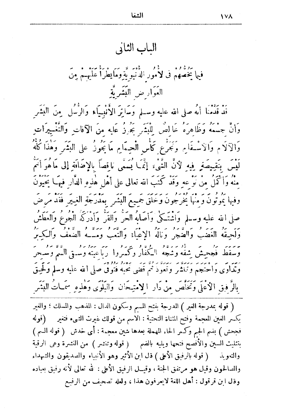 قَد قَدَّمْنَا أنَّه صَلَّى اللَّه عَلَيْه وَسَلَّم وَسَائِر الْأَنْبِيَاء وَالرُّسُل مِن البشر وَأَنّ جسمه وظاهره خالص للبشر يجوز عليه من الآفات والتغييرات والآلام والأسقام وتجزع كأس الحمام مَا يجوز عَلَى البشر وَهَذَا كله لَيْس بنقيصة فِيه لِأَنّ الشئ إنَّمَا يسمى ناقصًا بالإضافة إِلَى مَا هُو أتم مِنْه وأكمل من نوعه وَقَد كَتَب اللَّه تَعَالَى عَلَى أَهْل هَذِه الدار فِيهَا يحيون وفيها يموتون وَمِنْهَا يخرجون وخلق جميع البشر بمدرجة الغير فَقَد مرض صَلَّى اللَّه عَلَيْه وَسَلَّم واشتكى وأصابه الحر والقر وأدركه الجوع والعطش ولحقه الغضب والضجر وناله الإعياء والتعب ومسسه الضعف والكبر وسقط فجحش شقه وشجه الكفار وكسروا رباعيته وسقي السم وسحر وتداوى واحتجم وتنشر وتعوذ ثُمّ قضى نحبه فتوفي صَلَّى اللَّه عَلَيْه وَسَلَّم ولحق بالرفيق الأعلى وتخلص من دَار الامْتِحَان وَالبَلْوَى وَهَذِه سِمَات البَشَر