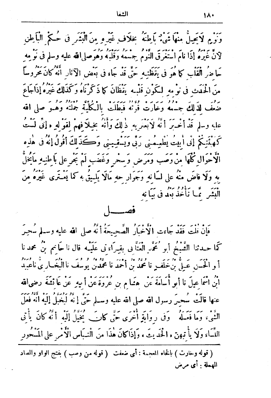 ونوم لَا يحل منها شئ باطنه بخلاف غَيْرِه مِن البشر فِي حكم الباطن لِأَنّ غَيْرِه إذَا نَام اسْتَغْرَق النَّوْم جِسْمَه وَقَلْبَه وَهُو صَلَّى اللَّه عَلَيْه وَسَلَّم فِي نَوْمِه حَاضِر القَلْب كَمَا هُو فِي يَقْظَتِه حَتَّى قَد جاء فِي بَعْض الآثار أنَّه كَان مَحْرُوسًا مِن الحدث فِي نَوْمِه لِكَوْن قَلْبه يَقْظَان كَمَا ذَكَرْنَاه وَكَذَلِك غَيْرِه إذَا جَاع ضَعُف لِذَلِك جِسْمُه وَخَارَت قُوَّتُه فَبَطَلَت بِالْكُلّيَّة جُمْلَتُه وَهُو صَلَّى الله عليه وسلم قد أخْبَرَ أنَّهُ لَا يَعْتَرِيه ذَلِك وَأنَّه بِخِلَافِهِم لِقَوْلِه (إِنِّي لست كهيئتكم إني أبيت يطعمني رَبِّي وَيَسْقِينِي وَكَذَلِك أقُول إنَّه فِي هَذِه الأحوال كُلّهَا من وَصَب وَمَرَض وَسِحْر وَغَضَب لَم يَجْر على بَاطِنِه مَا يُخلّ بِه وَلَا فَاض مِنْه عَلَى لِسَانِه وَجَوَارِحِه مَا لَا يَلِيق بِه كَمَا يَعْتَري غَيْرِه مِن البَشَر مِمَّا نَأْخُذ بَعْد فِي بَيَانِه