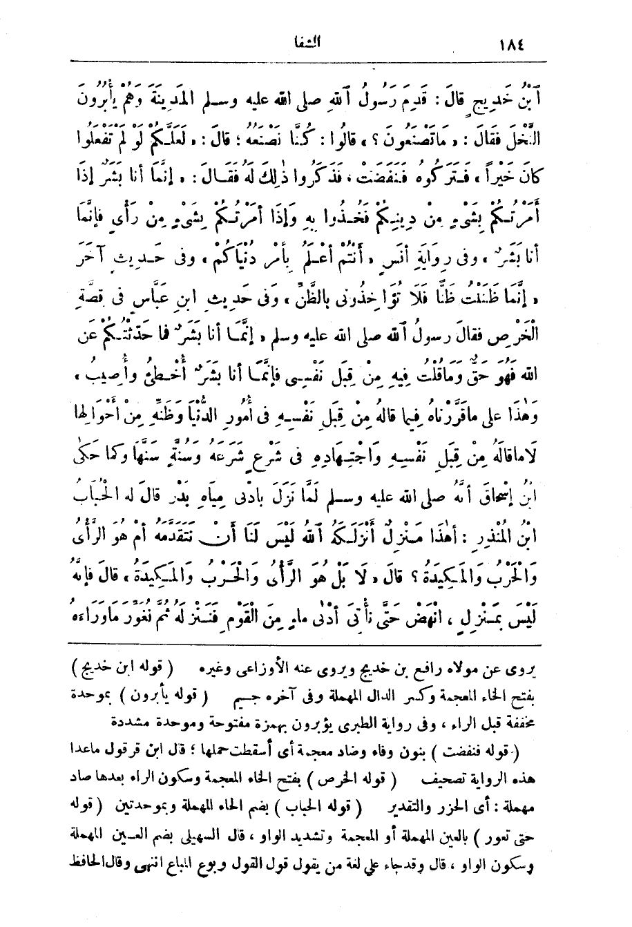 ابن خَدِيجٍ قَالَ: قَدِمَ رَسُولُ اللَّهِ صَلَّى اللَّهُ عَلَيْهِ وَسَلَّمَ الْمَدِينَةَ وَهُمْ يُأَبِّرُونَ النَّخْلَ فَقَالَ: (مَا تَصْنَعُونَ؟) قَالُوا: كُنَّا نَصْنَعُهُ، قَالَ: (لَعَلَّكُمْ لَوْ لَمْ تَفْعَلُوا كَانَ خَيْرًا) فَتَرَكُوهُ فَنَفَضَتْ، فَذَكَرُوا ذَلِكَ لَهُ فَقَالَ: (إِنَّمَا أَنَا بَشَرٌ إِذَا أمرتكم بشئ مِنْ دِينِكُمْ فَخُذُوا بِهِ وَإِذَا أمَرْتُكُمْ بشئ من رأى فَإِنَّمَا أَنَا بَشَرٌ) وَفِي رِوَايَةِ أَنَسٍ (أَنْتُمْ أَعْلَمُ بِأَمْرِ دُنْيَاكُمْ) وَفِي حَدِيثٍ آخَرَ (إِنَّمَا ظَنَنْتُ ظنا فلا تؤاخذني بِالظَّنِّ) وَفِي حَدِيثِ ابْنِ عَبَّاسٍ فِي قِصَّةِ الْخَرْصِ فَقَالَ رَسُولُ اللَّه صَلَّى اللَّه عَلَيْه وَسَلَّم (إِنَّمَا أَنَا بَشَرٌ فَمَا حَدَّثْتُكُمْ عَنِ اللَّهِ فَهُوَ حَقٌّ وَمَا قُلْتُ فِيهِ مِنْ قِبَلِ نَفْسِي فَإِنَّمَا أَنَا بَشَرٌ أخطئ وَأُصِيبُ) وَهَذَا عَلَى مَا قَرَّرْنَاه فِيمَا قاله من قِبَل نَفْسِه فِي أُمُور الدُّنْيَا وظنه من أحوالها لَا مَا قاله من قَبْل نفسه واجتهاده فِي شرع شرعه وسنة سنها وكما حكى ابن إسحاق إنَّه صَلَّى اللَّه عَلَيْه وَسَلَّم لَمَّا نَزَلَ بأدنى مياه بدر قَال لَه الحباب ابن المنذر: أهذا منزل أنزلكه اللَّه لَيْس لَنَا أَنّ نتقدمه أم هُو الرأي والحرب والمكيدة؟ قَال (لَا بَل هُو الرَّأي والْحَرْب والمكيدة) قَال فَإنَّه لَيْس بِمَنْزِل، أنْهَض حَتَّى نَأْتِي أدْنى ماء من القوم فننزله ثُمّ نَغَوَّر مَا وراءه