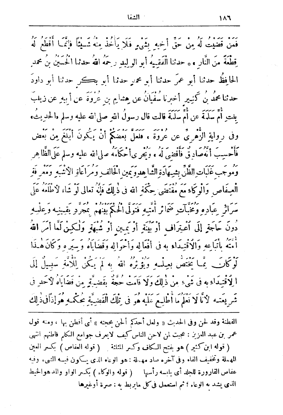 فَمَنْ قَضيْتُ لَهُ مِنْ حَقِّ أَخِيهِ بشئ فَلَا يَأْخُذْ مِنْهُ شَيْئًا فَإِنَّمَا أَقْطَعُ لَهُ قِطْعَةً مِنَ النَّارِ) * حَدَّثَنَا الْفَقِيه أَبُو الْوَلِيد رَحِمَه الله حدثنا الحسين بن محمد الحافظ حدثنا أبو عُمَر حَدَّثَنَا أَبُو مُحَمَّد حَدَّثَنَا أَبُو بَكْر حَدَّثَنَا أَبُو دَاوُد حَدَّثَنَا مُحَمَّد بن كثير أَخْبَرَنَا سُفْيَان عَن هِشَام بن عُرْوَة عَن أبيه عن زَيْنَبَ بِنْت أُمّ سَلَمَة عَن أم سَلَمَة قَالَت قَال رَسُول اللَّه صَلَّى اللَّه عَلَيْه وَسَلَّم (الْحَدِيث) وَفِي رِوَايَة الزُّهْرِيّ عَن عُرْوَة) فَلَعَلَّ بَعْضُكُمْ أَنْ يَكُونَ أَبْلَغَ مِنْ بَعْضٍ فَأَحْسَبُ أَنَّهُ صَادِقٌ فَأَقْضِيَ لَهُ) ويُجْري أحْكَامَه صَلَّى اللَّه عَلَيْه وَسَلَّم عَلَى الظَّاهِر وَمُوجَب غَلبَات الظَّنّ بِشِهَادَة الشَّاهِد وَيَمين الحَالف وَمُراعَاة الأشْبَه وَمَعْرِفَة العْفَاص وَالْوِكَاء مَع مُقْتَضَى حِكْمَة اللَّه فِي ذَلِك فَإنَّه تَعَالَى لَو شَاء لأطْلَعَه عَلَى سَرَائِر عِبَادِه وَمُخَبّآت ضَمَائر أُمَّتِه فَتَولَّى الحُكْم بَيْنَهُم بِمُجَرَّد يَقِينِه وَعِلْمِه دون حَاجَة إِلَى اعْتِرَاف أَو بَيَّنَة أَو يَمِين أَو شُبْهَة وَلَكِن لَمّا أمَر اللَّه أمَّتَه باتباعه والاقتداء بِه فِي أفْعَالِه وَأحْوَالِه وَقَضَايَاه وَسِيَرِه وَكَان هَذَا
