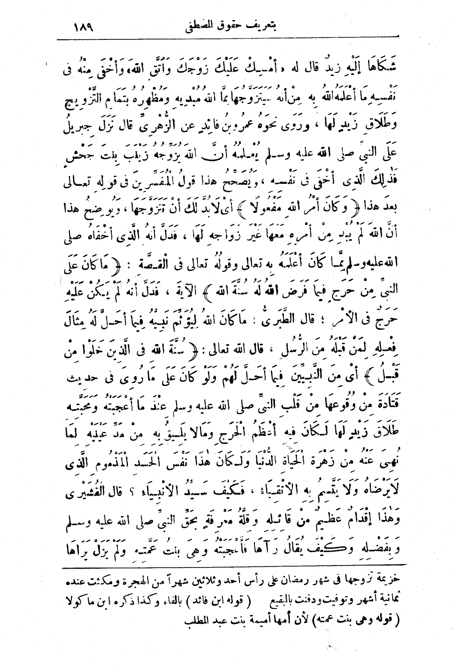 شَكَاهَا إليْه زيد قَال لَه (أَمْسِكْ عَلَيْكَ زَوْجَكَ وَاتَّقِ اللَّهَ) وأخْفَى مِنْه فِي نَفْسِه ما أعلمه الله به من أنه يتزوجها بما اللَّه مُبْديِه وَمُظْهِرُه بِتَمَام التَّزْوِيج وَطَلَاق زَيْد لَهَا، وَرَوَى نحو عَمْرو بن فائِد عَن الزُّهْرِيّ قَال نَزَل جِبْرِيل عَلَى النَّبِيّ صَلَّى اللَّه عَلَيْه وَسَلَّم يُعْلِمُه أَنّ اللَّه يُزَوَّجُه زَيْنَب بِنت جَحْش فَذَلِك الَّذِي أخْفَى فِي نَفْسِه، ويُصَحَّح هَذَا قَوْل الْمُفَسّرِين فِي قَوْلِه تَعَالَى بَعْد هَذَا (وَكَانَ أَمْرُ اللَّهِ مَفْعُولا) أي لَا بُدّ لَك أن تَتَزَوَّجَهَا، وَيُوضِح هَذَا أَنّ الله لَم يُبْد من أمْرِه معها غَيْر زَوَاجِه لَهَا، فَدَلّ أنَّه الَّذِي أخْفَاه صَلَّى اللَّه عَلَيْه وَسَلَّم مِمَّا كَان أعْلَمَه بِه تَعَالَى وَقَوْلُه تَعَالَى فِي الْقِصَّة: (مَا كَانَ عَلَى النَّبِيِّ مِنْ حَرَجٍ فِيمَا فَرَضَ اللَّهُ لَهُ سُنَّةَ الله) الآيَة، فَدَلّ أنَّه لَم يَكُن عَلَيْه حرج فِي الأمر، قَال الطَّبَرِيّ مَا كَان اللَّه ليؤثم نبيه فِيمَا أحل لَه مثال فعله لمن قبله مِن الرُّسُل، قَال اللَّه تَعَالَى: (سُنَّةَ اللَّهِ فِي الَّذِينَ خَلَوْا مِنْ قَبْلُ) أي مِن النَّبِيّين فِيمَا أحل لَهُم وَلَو كَان عَلَى مَا رُوِي فِي حَدِيث قَتَادَة من وُقُوعهَا من قَلْب النَّبِيّ صَلَّى اللَّه عَلَيْه وَسَلَّم عِنْد مَا أعْجَبَتْه ومحبته طلاق زيد لَهَا لكان فِيه أعظم الحرج وَمَا لَا يليق بِه من مد عَيْنَيْه لَمّا