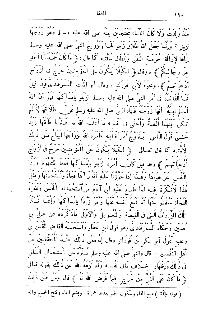 مُنْذ ولدت وَلَا كَان النّسَاء يحتجبن مِنْه صَلَّى اللَّه عَلَيْه وَسَلَّم وَهُو زوجها لزيد؟ وَإِنَّمَا جَعَل اللَّه طلاق زيد لَهَا وتزويج النَّبِيّ صَلَّى اللَّه عَلَيْه وَسَلَّم إياها لإزالة حرمة التبني وإبطال سنته كَمَا قَال: (مَا كَانَ مُحَمَّدٌ أَبَا أَحَدٍ مِنْ رِجَالِكُمْ) * وقال (لكيلا يَكُونَ عَلَى الْمُؤْمِنِينَ حَرَجٌ فِي أَزْوَاجِ أَدْعِيَائِهِمْ) ، وَنَحْوَه لابن فورك، وَقَال أَبُو اللَّيْث السَّمْرَقَنْدِيّ فَإِنّ قِيل فَمَا الفائدة فِي أمر النَّبِيّ صَلَّى اللَّه عَلَيْه وَسَلَّم لِزَيْد بإمْسَاكِهَا فَهُو أَنّ اللَّه أَعْلَم نبيه أنَّهَا زوجته فنهاه النَّبِيّ صَلَّى اللَّه عَلَيْه وَسَلَّم عَن طلاقها إِذ لَم تكن بَيْنَهُمَا ألفة وأخفى فِي نفسه مَا أعلمه اللَّه بِه فَلَمّا طلقها زيد خشي قَوْل النَّاس يتزوج امْرَأَة ابنه فأمره اللَّه بزواجها ليُبَاح مِثْل ذَلِك لأمته كما قال تعالى (لكيلا يَكُونَ عَلَى الْمُؤْمِنِينَ حَرَجٌ فِي أَزْوَاجِ أَدْعِيَائِهِمْ) وَقَد قِيل كَان أمره لزيد بإمساكها قمعًا للشهوة وردًا للنفس عَن هواها وهذا إذا جوزنا عَلَيْه أنَّه رآها فجأة واستحسنها ومثل هَذَا لَا نكرة فِيه لَمّا طبع عَلَيْه ابن آدَم مِن استحسانه الْحَسَن ونظرة الفجأة معفو عنها ثُمّ قمع نفسه عَنْهَا وأمر زيدًا بإمساكها وَإِنَّمَا تنكر